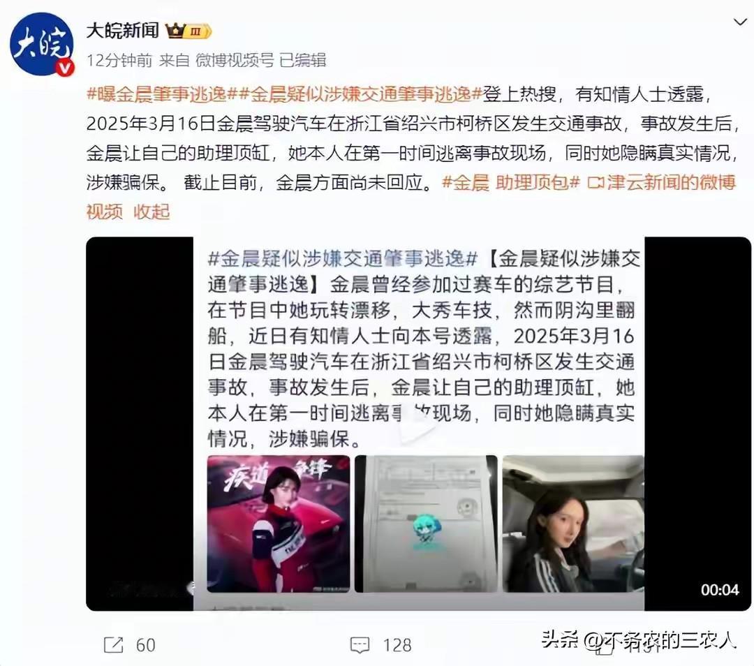 今天,一则“明星金晨肇事逃逸”的新闻上了热搜。 点评几句:从常理来看,明星作为公众人物,日常面临的舆论关注度本就远高于普通人,但交通事故本身并非不可化解的“致命危机”。若是一起普通的剐蹭或碰撞,即便涉及财产损失甚至轻微人员受伤,按照正常流程,无非是报警定损、依法理赔即可。 以金晨的行业地位和经济实力,“用钱解决”本是最直接也最稳妥的选择,即便事件引发短暂关注,也绝不会对其演艺生涯造成颠覆性影响,更不至于撼动其商业价值。 毕竟在公众认知中,意外事故难以完全规避,主动承担责任反而可能收获“有担当”的正面评价。 但是金晨却选择了逃逸并找人顶包,明显有问题。如此看来,金晨一方甘愿冒着身败名裂的风险选择逃逸,甚至可能找人顶包,背后必然隐藏着比普通交通事故严重得多的隐情——而最符合逻辑的推测,便是当时的驾驶状态存在重大问题,大概率不是酒驾,就是毒驾。 要知道,酒驾、毒驾属于严重违法行为,一旦被警方查实,面临的不仅是高额罚款、吊销驾照,更可能涉及刑事责任,而这两种行为一旦与明星身份绑定,几乎等同于演艺生涯的“死刑”,所有商业代言会立刻解约,待播作品会面临下架风险,多年积累的口碑与事业将毁于一旦。 真相到底如何,随着警方的介入,相信马上就会有结果。