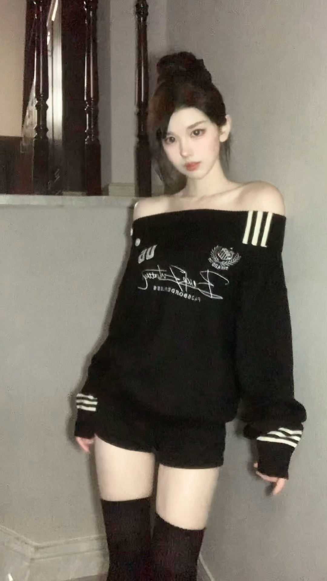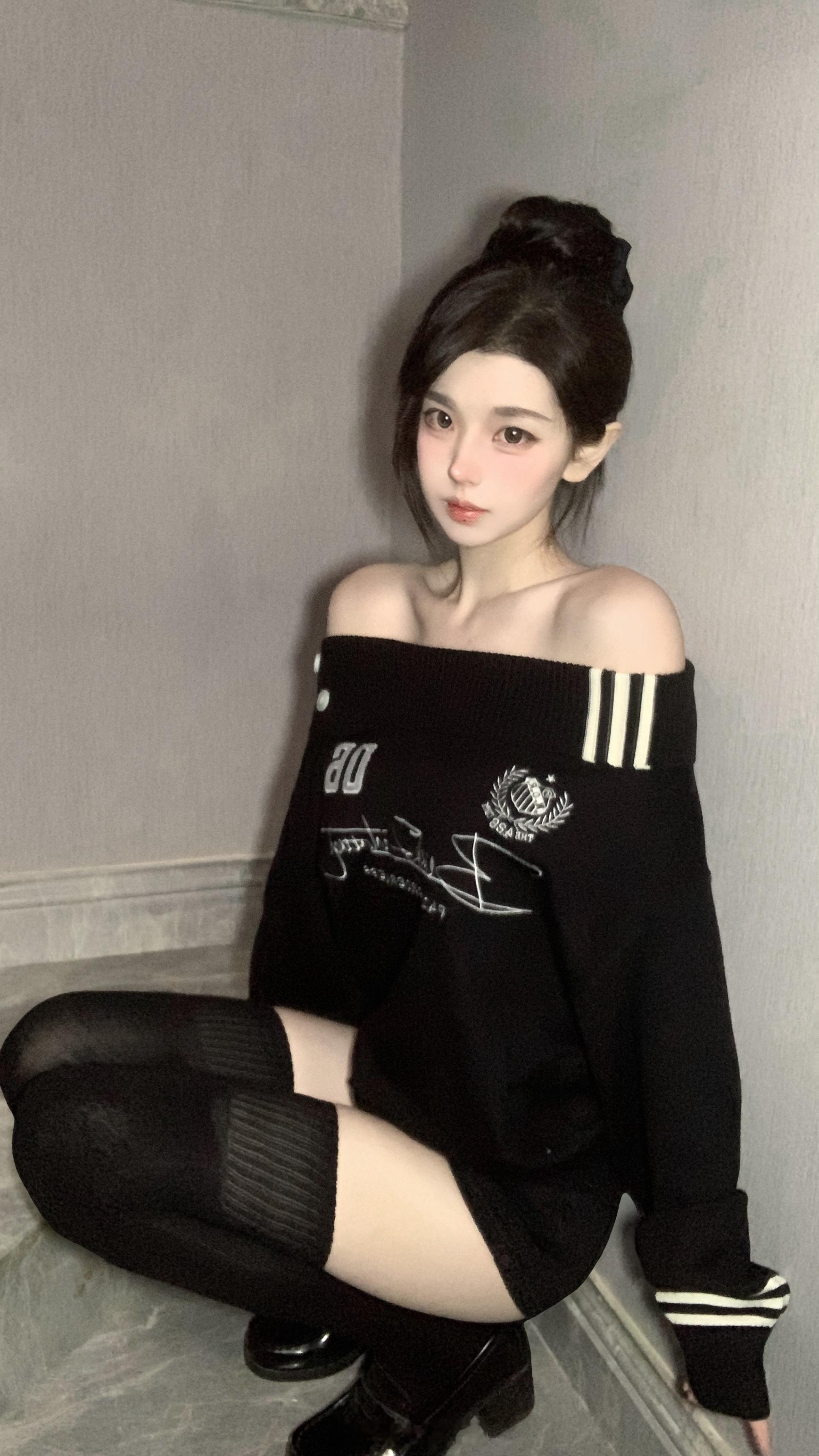 冰瓷玉肌冷白皮瓜子脸美人,茶棕直卷发系带蓬松垂肩,深红哥特裙配精致首饰,小区石砖