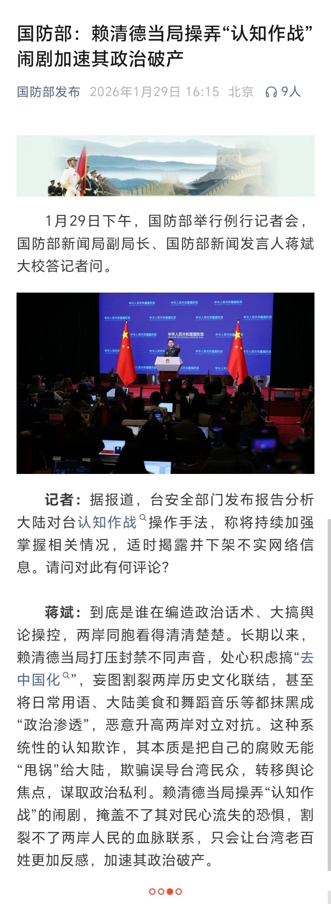 赖清德当局闹剧加速其政治破产国防部:赖清德当局操弄“认知作战”闹剧加速其政治破产