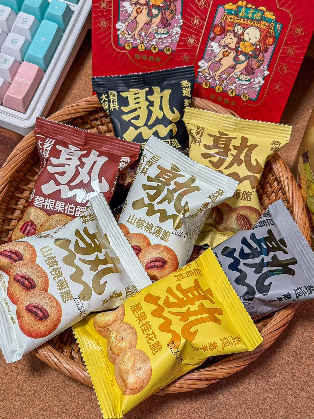 熟道新出的第一桶金,寓意美好太适合新年了🧧。满满一大桶里🈶七种口味,腰果桂花、山核桃薄脆、碧根果伯爵、夏威夷果仁、黑芝麻可可脆…种类丰富。 口感嘎嘣脆,奶味浓郁混合坚果的醇香,一口一个好满足啊!买来做下午茶,解馋垫肚子很适合。 熟道熟道坚果脆坚果脆健康零食年货零食下午茶搭子年货零食办公室零食推荐