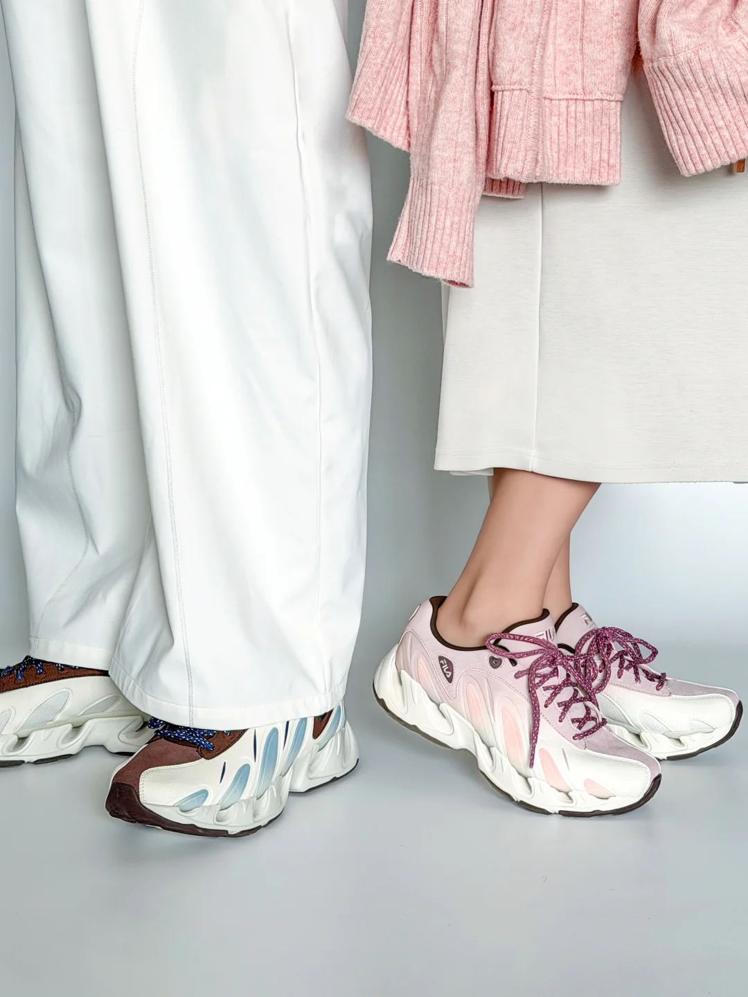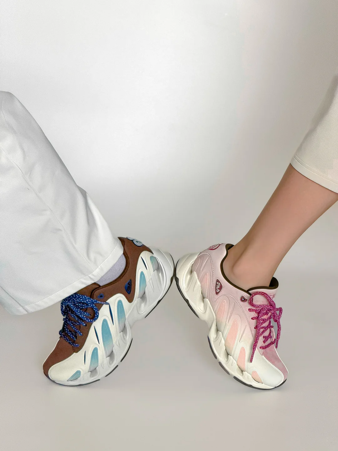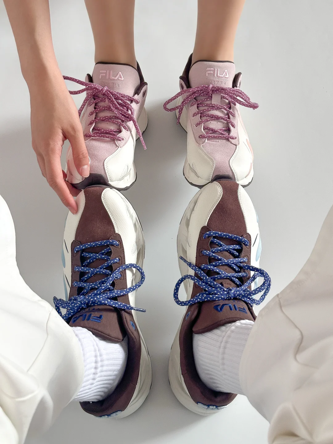 无意外、又一次!情侣鞋选择了FILA VETTA❗️ 不仅黑白色、原来[💘粉蓝CP]也能被V头鞋演绎的这么好看。