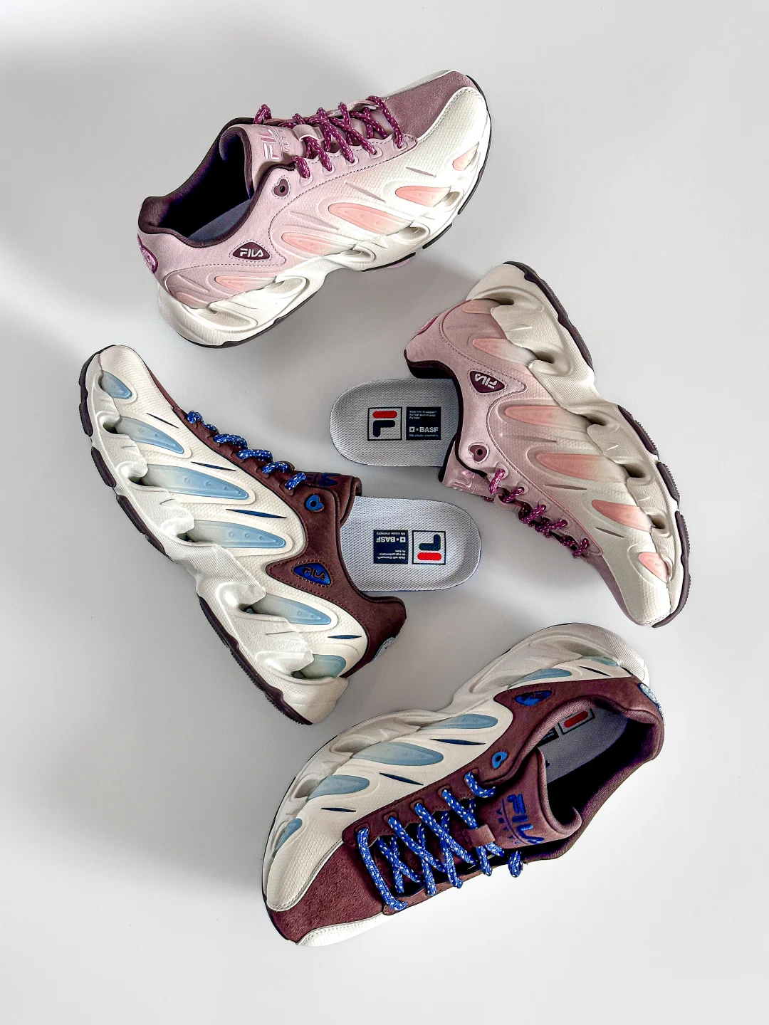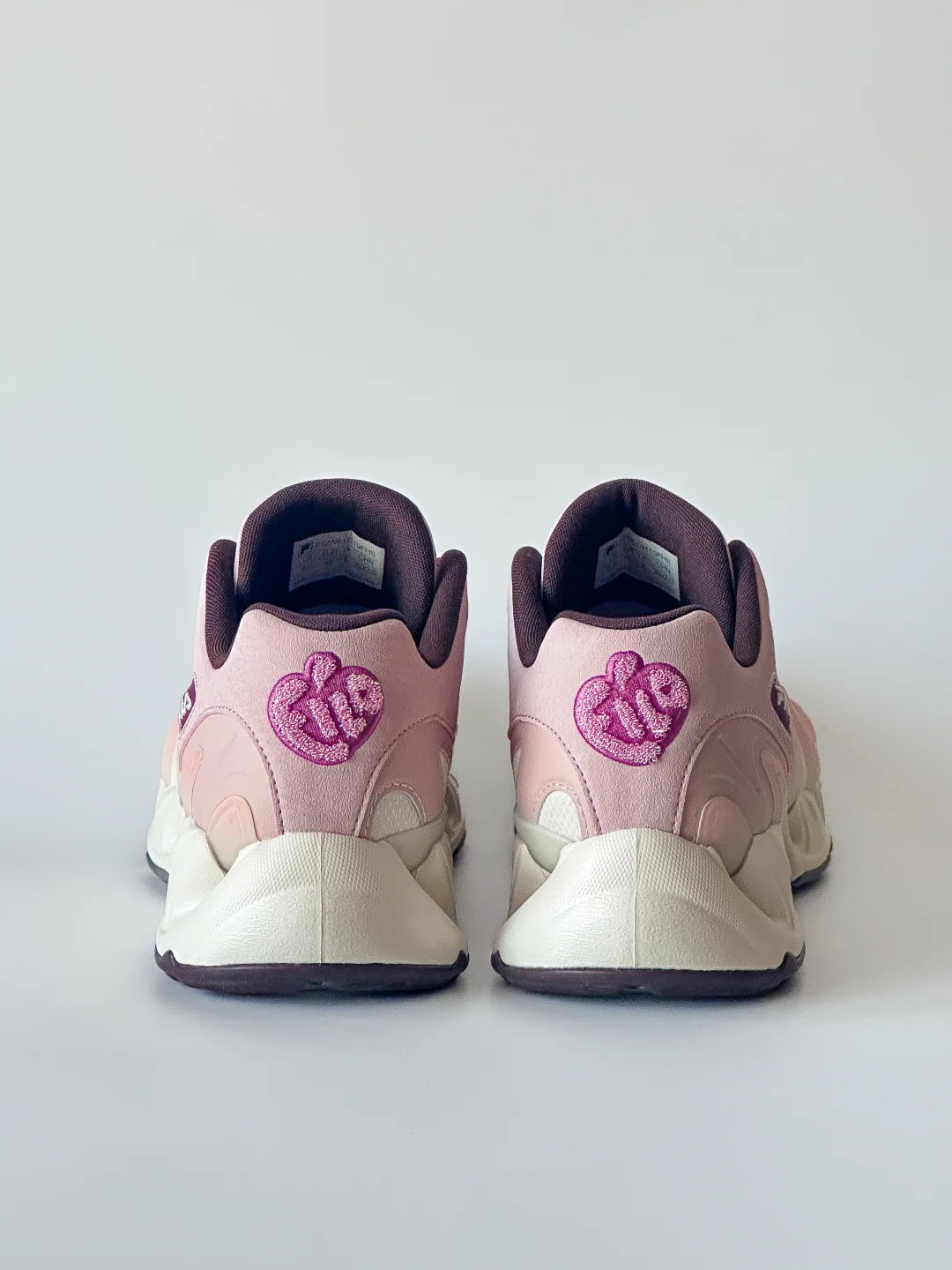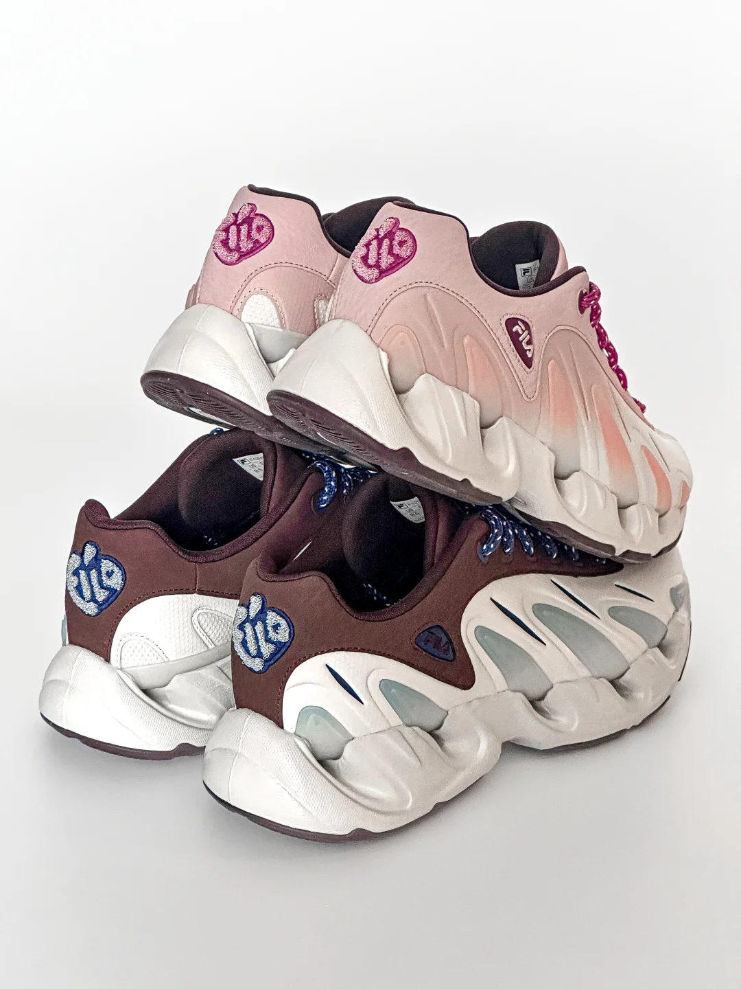 主体粉色和蓝色的渐变色调、既不普通又像初恋的一般、仿佛有一种暧昧的氛围感。鞋身下部多组水滴形状的设计元素,搭配粉色蓝色,像是双方同频升温的感情气泡🫧。