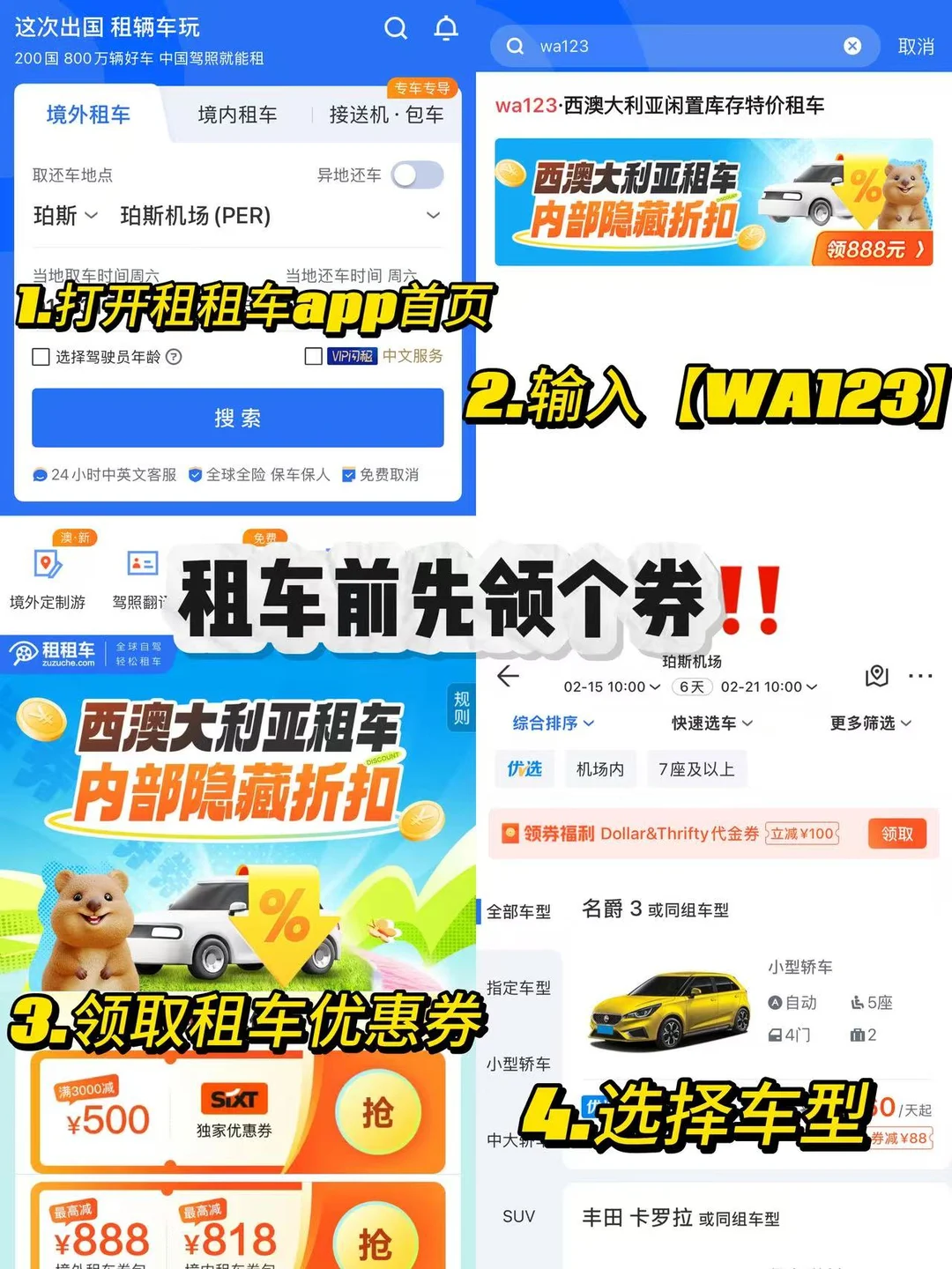 🌊💫很早前就向往着来西澳自驾,一直被它独一无二沙丘、海浪和岩石吸引,这次终于踏上行程了!感受是不虚此行,西澳被称作自驾天花板是有道理的。这次我们珀斯出发,直接1500km环线自驾!落地机场提车,直接载着一家老小开启假期时光。被大家追着问的7日行程安排来啦👇,老少皆宜 . 💙D1:珀斯→玛格丽特河罗马风石头阵、印度洋蓝、魔鬼鱼 🧡D2:玛格丽特河→Canal Rock海上小火车、钟乳石洞穴、巨浪礁石奇观 💜D3:曼哲拉→伍德里奇yenchap公园、回程路过珀斯JayMV的蓝房子 💚D4:伍德布里奇→霍罗克斯尖峰石阵外星地貌、房车营地 💖D5:霍罗克斯→杰拉尔顿天然粉湖Hutt Lagoon、红色峡谷日落、自然之窗 🤍D6:杰拉尔顿→珀斯白色沙漠滑沙体验、玻璃海、歪脖子树 💙D7:珀斯→Rottnest岛透明海域、找Quokka微笑鼠鼠自拍、追鲸环岛骑行海湾 . 🚗出发前准备|小交通安排✨租车这次选择的是【租租车】app,平台上合作的国外车行很多,可以一次性看到所有车,选择自己喜欢的车车下单就可以~ . 🚗车车选择:我这次选择的是DTG旗下Thrifty车行的一辆SUV,体验超好,这是全澳最大车队,都是2年年新车,车型非常全,租租车下单后,提前在app上免费办好国际驾照翻译认证件,到了机场直接取还车。SUV适合一家出行,行李妥妥装! . 💰全险关:人生地不熟,车损全包才放心,隐性消费?不存在的!这次我有发言权,西澳沿途小动物多,我们开车过程中一只乌鸦飞来把车前灯撞得凹陷。根本不用一路忐忑赔偿,全包啦 🫶守护关:凌晨抛锚?荒郊迷路?突发情况?7*24小时中英文客服全程保驾护航,无后顾之忧 . ‼️最近租租车有针对西澳目的地的内部隐藏折扣,被我找到啦!大家也快去领~最近想去澳洲的别错过👀直接能省下一顿海鲜钱! 1.先打开租租车app 2.首页搜索栏输入【WA123】 3.进入页面直接领劵 4.下单就能立减享受优惠 . 📌实用小贴士 🧴物品清单:防晒霜、防晒衣、驱蚊液、防虫面罩、墨镜、帽子(澳洲阳光“热情”过猛!)西澳景点绝美但分散,非常适合自驾出行,一路上的景色都充满震撼,不愧是Home of Road Trip,希望大家都能在西澳拥有绝佳的自驾体验~ . . 💬互动时间:西澳的哪个景点最让你心动?快来评论区种草!👇