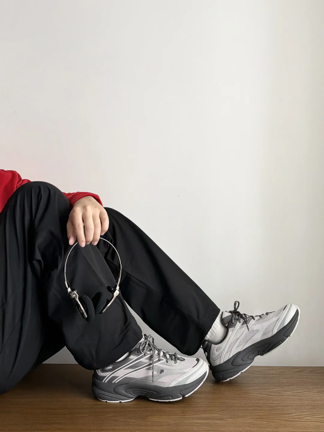 光迹鞋的渐变配色太绝了,绒感革料配渐变印刷,黑灰主色调碰撞超有视觉冲击,鞋身线条利落带点未来感,上脚轻弹还显脚型好看,搭一件红色卫衣和防晒运动帽,过年潮酷氛围感直接拿捏了。