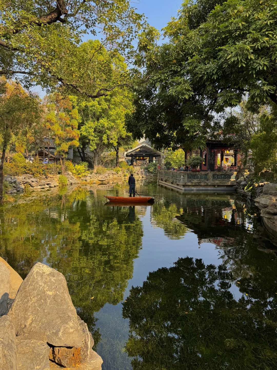 梁园由清代梁氏叔侄四人历时五十多年建成,一草一木都透着诗书世家的雅气。园子里榕荫、竹影、石山、曲水交织成画,没有太多喧嚣的游客,只有微风穿过廊窗的轻响。晴天午后☀️☀️阳光穿过层层树叶,在水面投下斑驳晃动的光斑。摇曳的树影每一帧都像会呼吸的岭南水墨画。