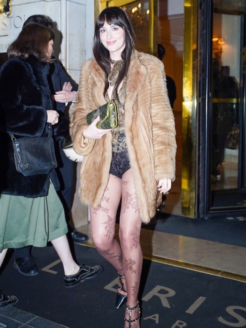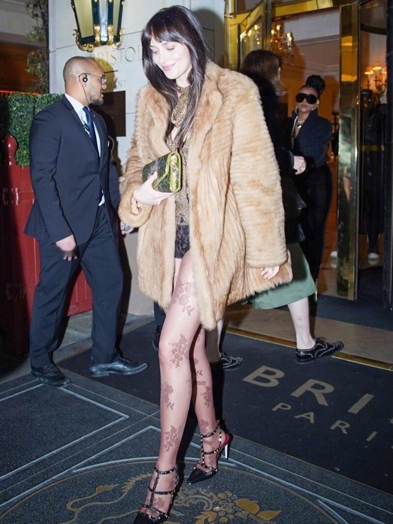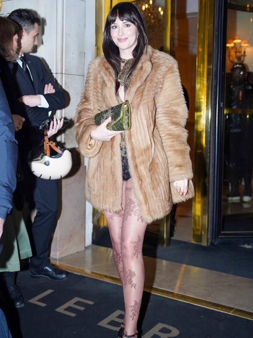 达科塔·约翰逊(Dakota Johnson)在法国巴黎离开酒店前往 Valentino 2026高定系列发布秀秀后party。这一身比看秀造型好看多了!巴黎高定时装周