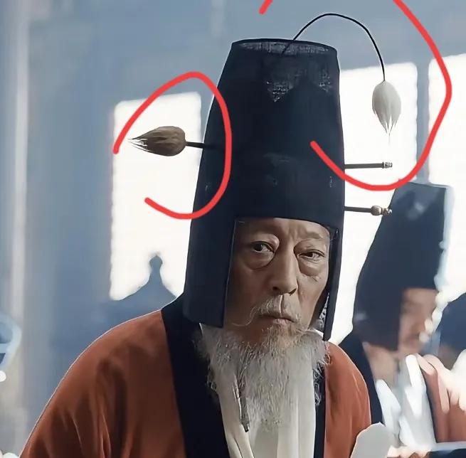 这是太平年里的帽子,能设计这帽子的也是想象力丰富了。 一查,才知道唐末五代十国时期公员帽子就是狗尾续貂。 他们帽子上喜欢用貂毛做装饰,后来封的公职太多了,貂毛不够了,用狗尾巴毛代替,所以就叫,狗尾续貂。 而且身份越大挂越多毛球,你看这年一位两个毛球,一位是只有一个毛球。
