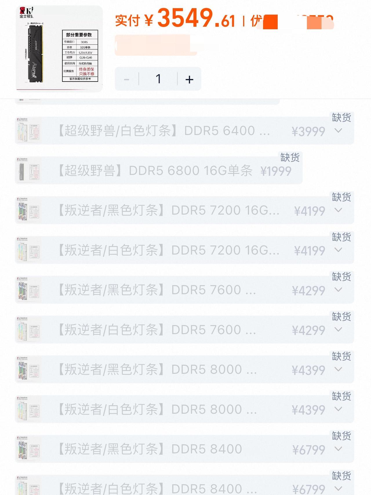 谁也没想到DDR5内存涨得比黄金还猛啊[泣不成声][泣不成声]而且没有停下来的势头,26年准备装机的天塌了。。现在一根16GB的DDR5 6000Mhz频率高时序的杂牌条子,都敢卖你1800?? 更不用说高频率低时序的了。 要知道25年初,同频率64GB的芝奇DDR5也才1300左右。。那时候我记得8400MHz频率的32GB也就七八百,顶多一千。现在涨飞了干到六千多了,甚至高频率的内存条很多型号都下架了。。 以前那种6000Mhz频率,时序CL32以上的内存条看都没人看,现在都买不起了[捂脸]你们现在用啥规格的内存条?