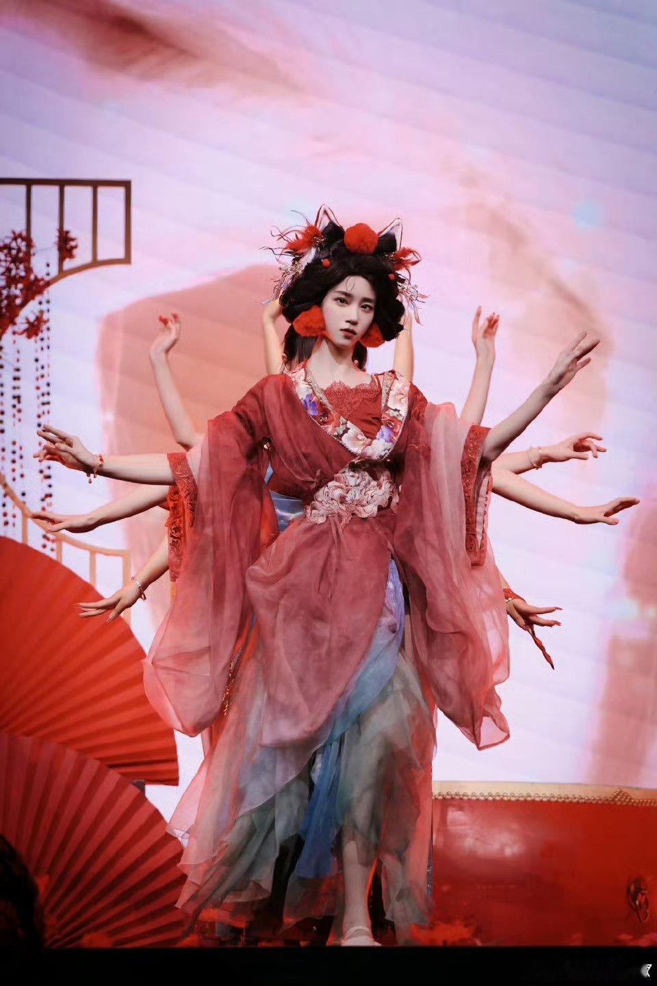 欧阳娣娣摇曳生姿红玫瑰一出场就惊艳全场!红蕾丝抹胸搭黑裤飒美兼具,羊毛卷齐刘海灵