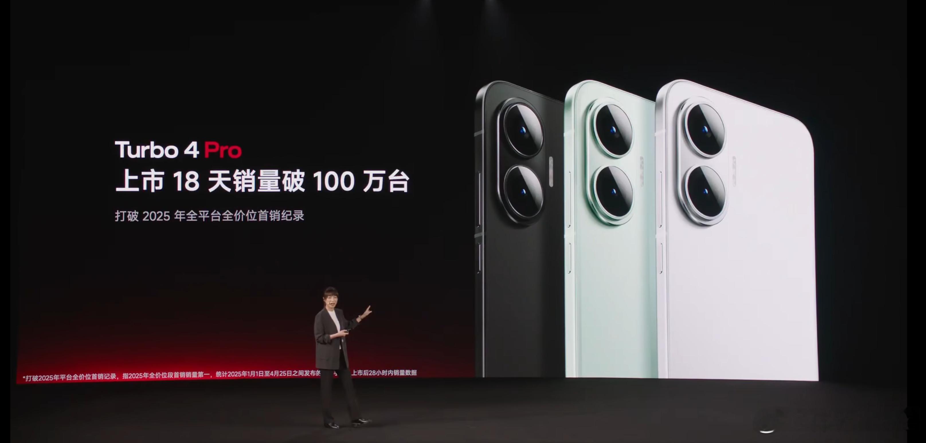 行业惯例,先吹成绩。Turbo系列一经上市就受到了消费者的喜爱,其中Turbo 4 Pro上市18天销量破100万台,打破了2025年全平台全价位首销纪录。红米Turbo5发布会