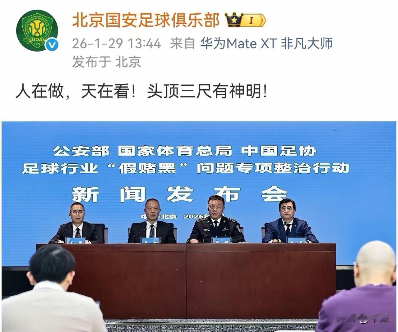 谁才是背后真正的大佬?北京国安硬刚足协一句“人在做,天在看,头顶三尺有神明”,直接把足球“假赌黑”整治的台面掀出了裂缝。 被扣5分、罚款40万的处罚砸下来,俱乐部没有认栽服软,反而硬气要证据、要说法,这可能不只是一家俱乐部的委屈,是整个行业对“程序透明”的集体诉求。 扫黑除恶是民心所向,没人会反对清理足球蛀虫,但罚得明白比罚得严厉更重要。如果只给处罚结果,不晒证据链,不公开调查细节,再正义的整治也容易变成糊涂账!球迷会猜是不是连坐”,俱乐部会怕“莫须有”,最终受损的是中国足球好不容易攒起来的公信力。 国安的硬气是在说:我们支持扫黑,但不能接受扣帽子式处罚。行业要净化,靠的不是“疑罪从有”,而是每一笔处罚都经得起推敲,每一个证据都晒在阳光下。只有让“谁违规、谁担责”的规则清晰可见,才能让真正的蛀虫无处遁形,也让清白的俱乐部敢挺直腰杆。 “头顶三尺有神明”,既是国安对自身清白的底气,也是对整治工作的提醒:足球的重生,需要的不仅是刮骨疗毒的勇气,更需要公开透明的底气。毕竟,只有让所有人都看到天网恢恢的细节,中国足球才能真正走出黑暗,迎来光明。