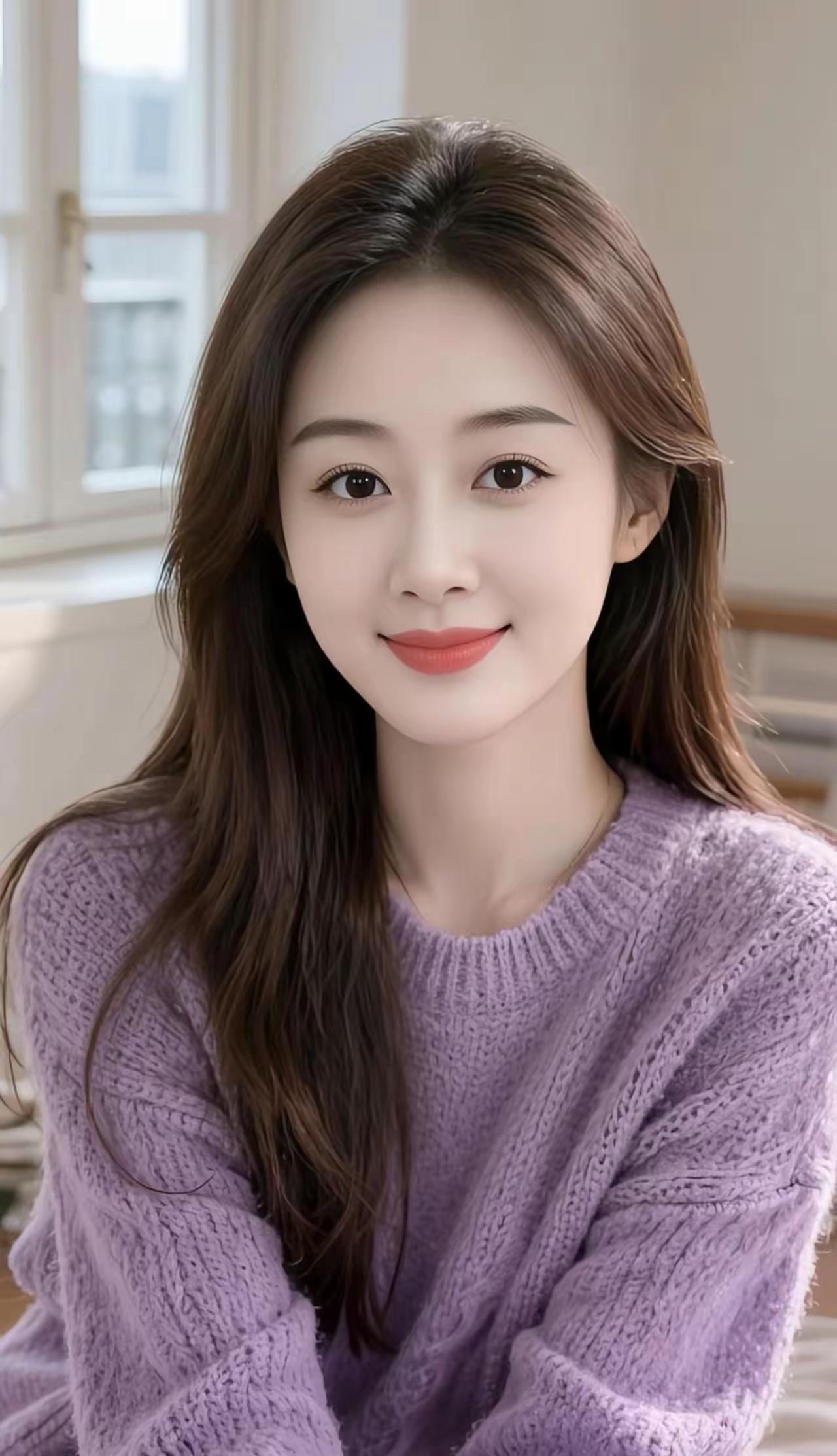 温柔甜美的少女,紫色毛衣搭配自然妆容,元气满满的一天!