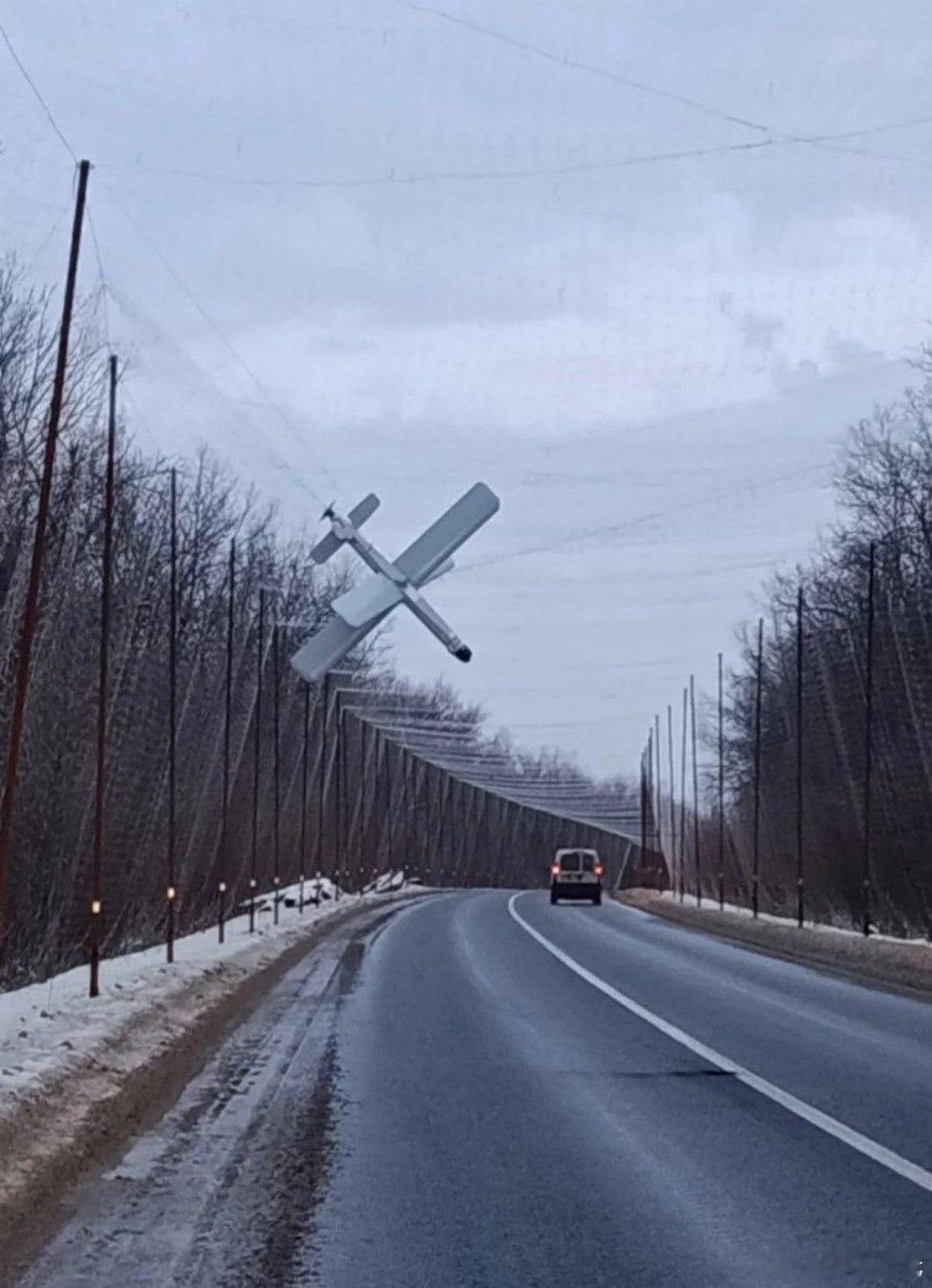 俄军“柳叶刀”无人机被乌军在道路上方设置的反无人机拦截网缠住。泽连斯基称乌克兰计