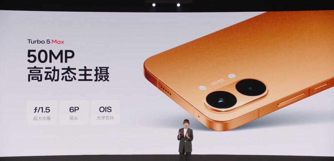 REDMI Turbo 5 Max 前置 20MP(豪威 OV20B,1/4"),后置: 50MP 主摄(光影猎人 600,1/2",12.5EV 动态范围,OIS)+8MP 超广角(思特威 SC821CS,1/4")红米Turbo5发布会