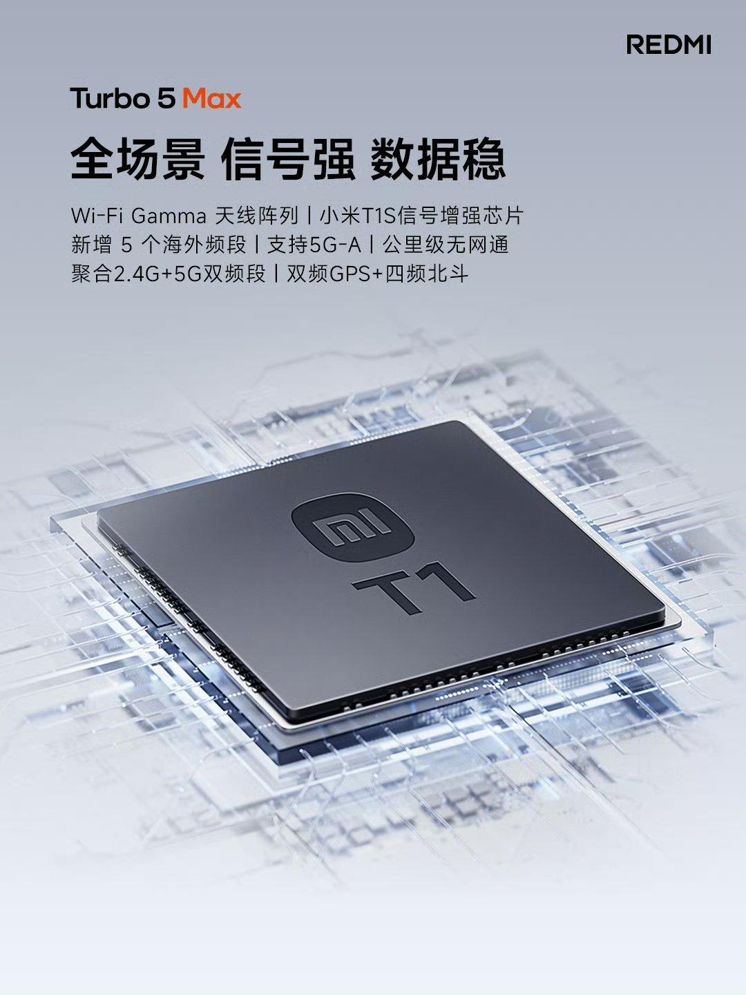 REDMI Turbo 5 Max 外围配置:0809 X 轴线性马达,双 1115F 扬声器,支持 NFC、红外遥控,IP66 & IP68 & IP69 & IP69K 防尘防水,Wi-Fi 7,蓝牙 5.4,四频北斗+双频 GPS,超声波指纹,厚 8.15mm,重 219g。Turbo5Max性能之上,体验同样 Max!① 50MP高动态主摄,支持高动态视频② 升级高性能天线组,专业级定位系统③ 旗舰级超声波指纹、防水大满贯④ 立体声双扬声器,支持 3% 音量调节 红米Turbo5发布会 Turbo5Max