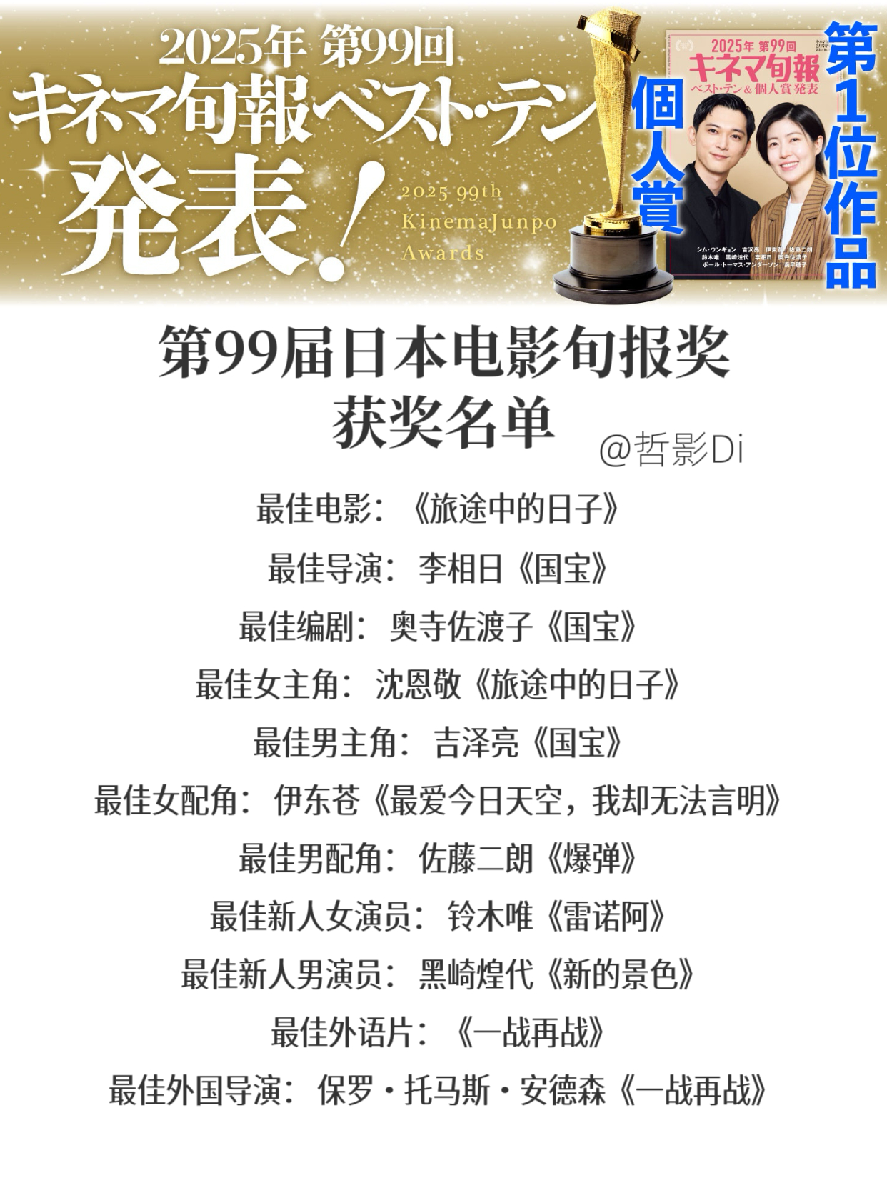 第99届日本电影旬报奖发布获奖名单,《旅途中的日子》获得最佳电影奖,《国宝》则获得包括最佳导演、最佳编剧在内的三项大奖,沈恩敬与吉泽亮分别凭借以上两部影片获得影后影帝。以下为获奖名单↓ ↓ ↓最佳电影:《旅途中的日子》最佳导演: 李相日《国宝》最佳编剧: 奥寺佐渡子《国宝》最佳女主角: 沈恩敬《旅途中的日子》最佳男主角: 吉泽亮《国宝》最佳女配角: 伊东苍《最爱今日天空,我却无法言明》最佳男配角: 佐藤二朗《爆弹》最佳新人女演员: 铃木唯《雷诺阿》最佳新人男演员: 黑崎煌代《新的景色》最佳外语片:《一战再战》最佳外国导演: 保罗·托马斯·安德森《一战再战》