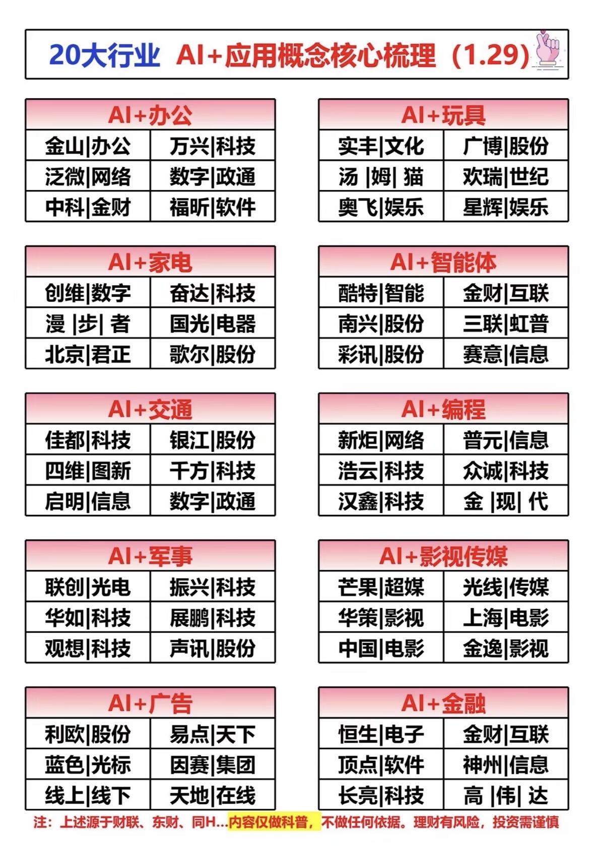 AI+20大行业应用概念梳理,带你领略科技前沿! AI赋能多行业:游戏、医疗、教育、工业等领域企业布局,科技浪潮推动产业升级,投资需理性看待市场机遇与风险。