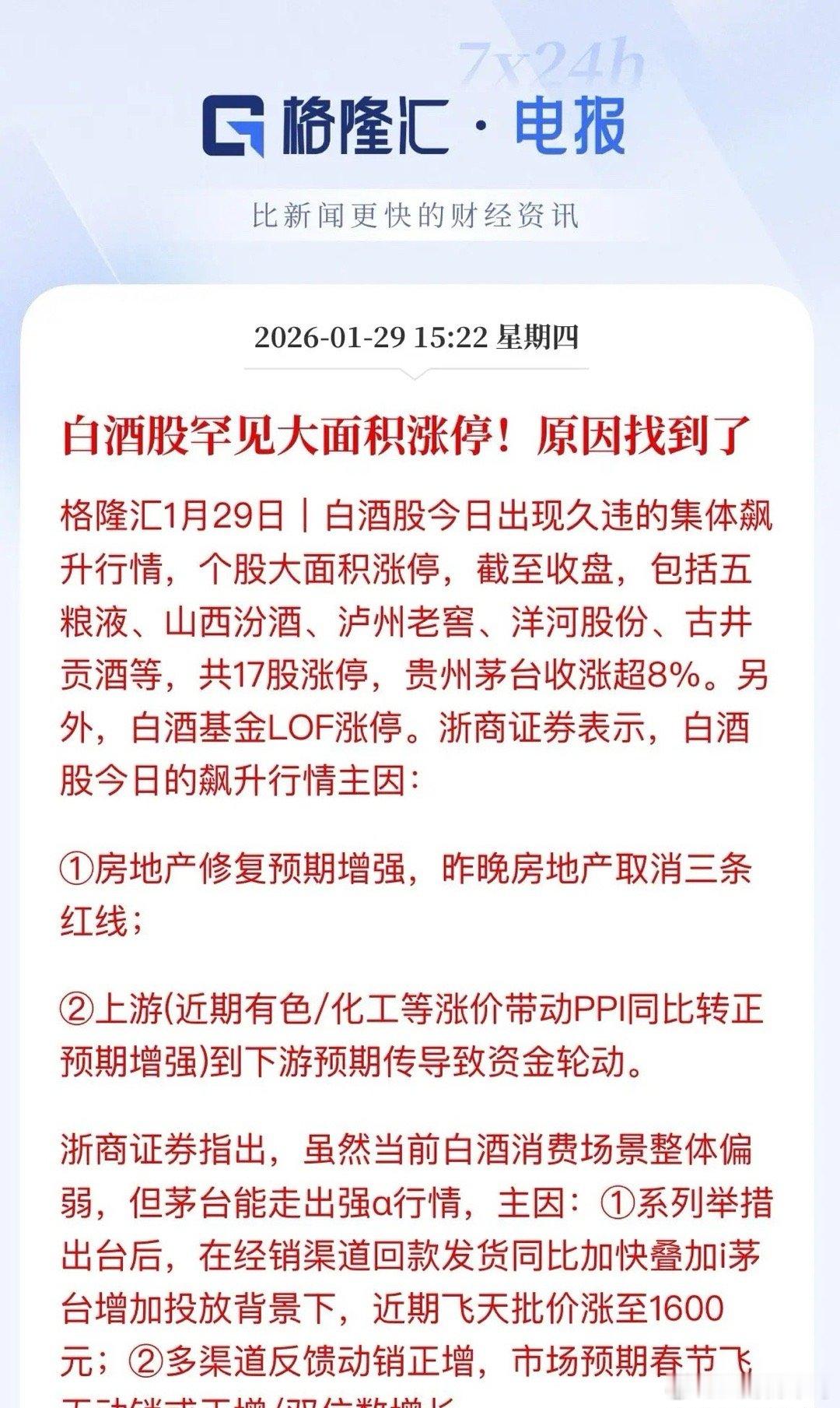 商业航天倒了,白酒却坐上火箭了,直冲云霄,他们说白酒板块集体涨停的原因找到了,全网都在找发生了什么,说是房地产“三条红线”松绑是昨天有新闻爆出,不过也算是给白酒直接干冒烟了但到底最核心原因是什么,是资金轮动,还是房地产的关联原因,或者资金开始炒春节消费市场预期,只有资金知道了,这异动明显不是散户,也不可能是游资,所以你猜的到的了,或者说人民币持续走高,站上6.93的区间位置,如果有外资要进来试水的话,会率先选择哪个,炒上热门的,还是低位埋伏红利高股息板块,毕竟美元走弱,美股最近也不振,资金也得找过地方呆,猜的,然后也你也可以猜猜。