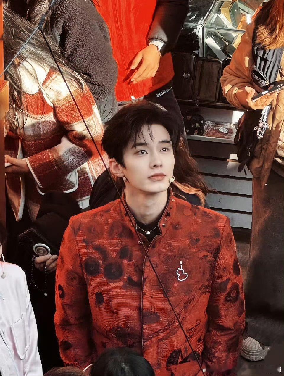 何与今天录制央视节目《欢欢喜喜过大年》路透,红色新中式好帅