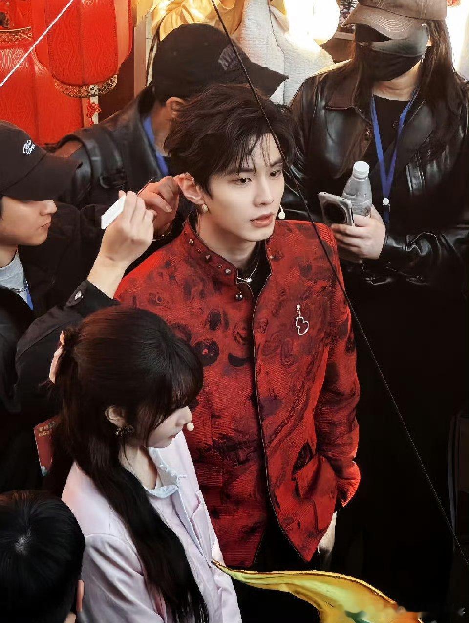 何与今天录制央视节目《欢欢喜喜过大年》路透 ,红色新中式好帅