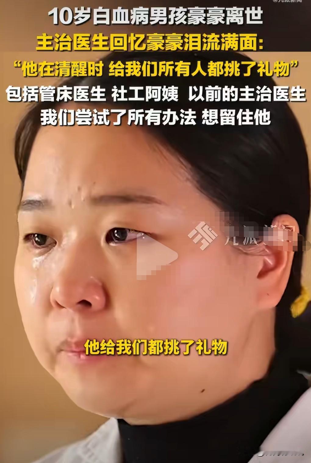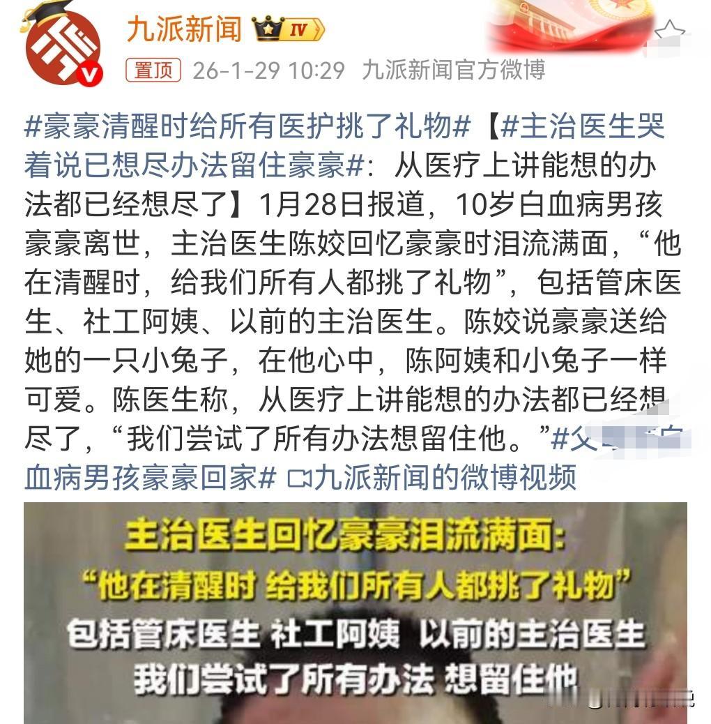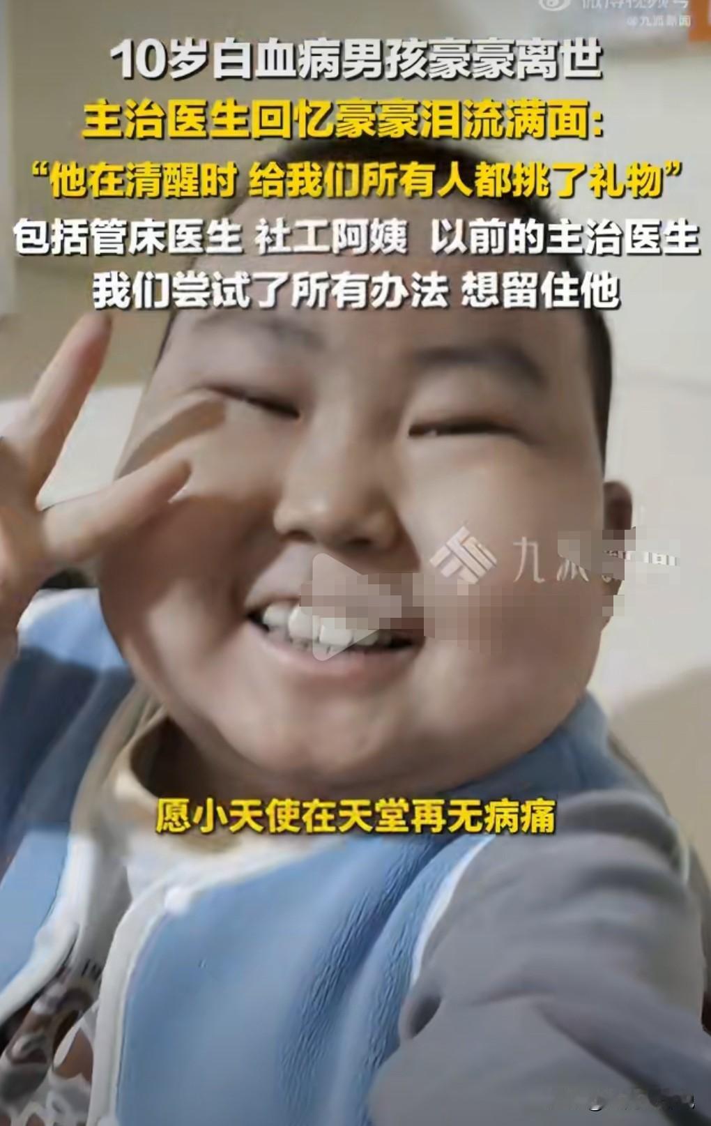 这真的是太悲剧了,像天使一样善良的小男孩竟然因为白血病去世了。 1月28日报道,10岁白血病男孩豪豪去世。 他生前的乐观感动了很多的人。 而且在他清醒时,他给所有医护都挑选了礼物。 这真的是个懂得感恩的孩子。 主治医生哭着说已想尽办法留住豪豪,尝试了所有方法。 最终还是去世了。 这孩子真让人心疼。