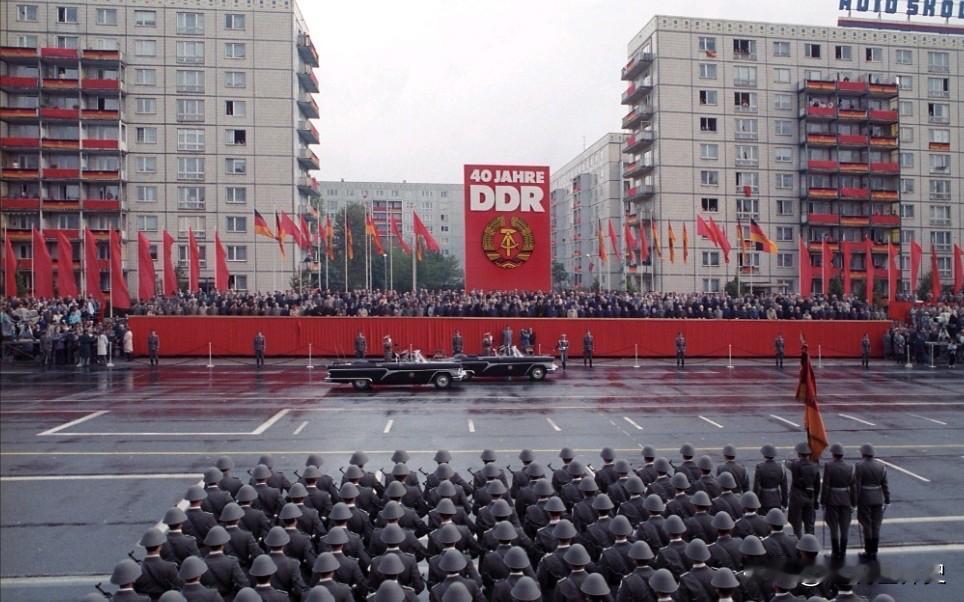 历史老照片:东德四十年大庆 1989年10月7日,东德举行规模宏大的成立40周年庆典。 然而,一个月后的11月9日,柏林墙即轰然倒塌,东德很快也成为历史记忆了…… 不由得感慨:历史有时也玩“快闪” ,突如其来、无法 预见…东德变迁 东德老照片