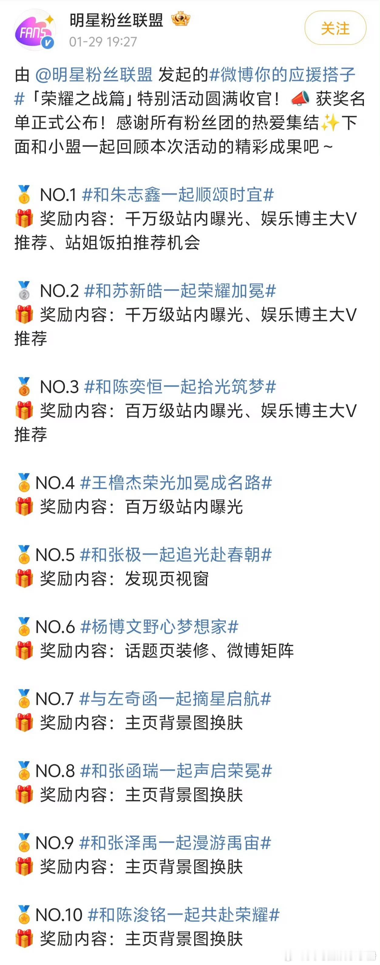 明星粉丝联盟荣耀之战应援获奖名单朱志鑫 苏新皓 陈奕恒 王橹杰 张极 杨博文 左奇函 张函瑞 张泽禹 陈浚铭 TF家族荣耀之战ready