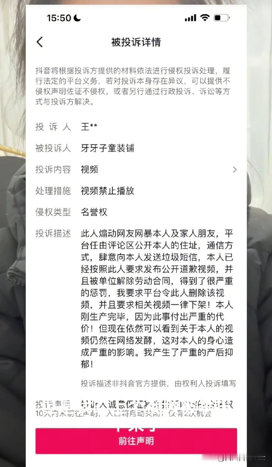 没想到女记者退棉衣骂商家的事还没完结。商家发视频说,本来她不想再回应这个事了,可是她的视频被女记者给举报下架了。她决定跟女记者硬刚到底。 商家说因为这件事,自己的店都关了,店里几百件库存都不知道怎么处理,明明她才是受害者。没想到女记者先委屈上了。女记者举报她的视频,说她的视频煽动网友网暴她。 女记者觉得自己已经得到了严重的惩罚,工作没了,又有严重的抑郁症,已经很惨了。她也已经道歉了,为什么还要对她赶尽杀绝,她要求平台删光所有相关的视频。 我觉得网上的新鲜事每天都很多,她这个事本来大家就快遗忘了。可是她偏偏出来找商家的麻烦,这件事恐怕又要上热搜。 评论区的网友清一色支持商家,商家说以后她可以删视频,但她会每天都发,看样是和女记者杠上了。