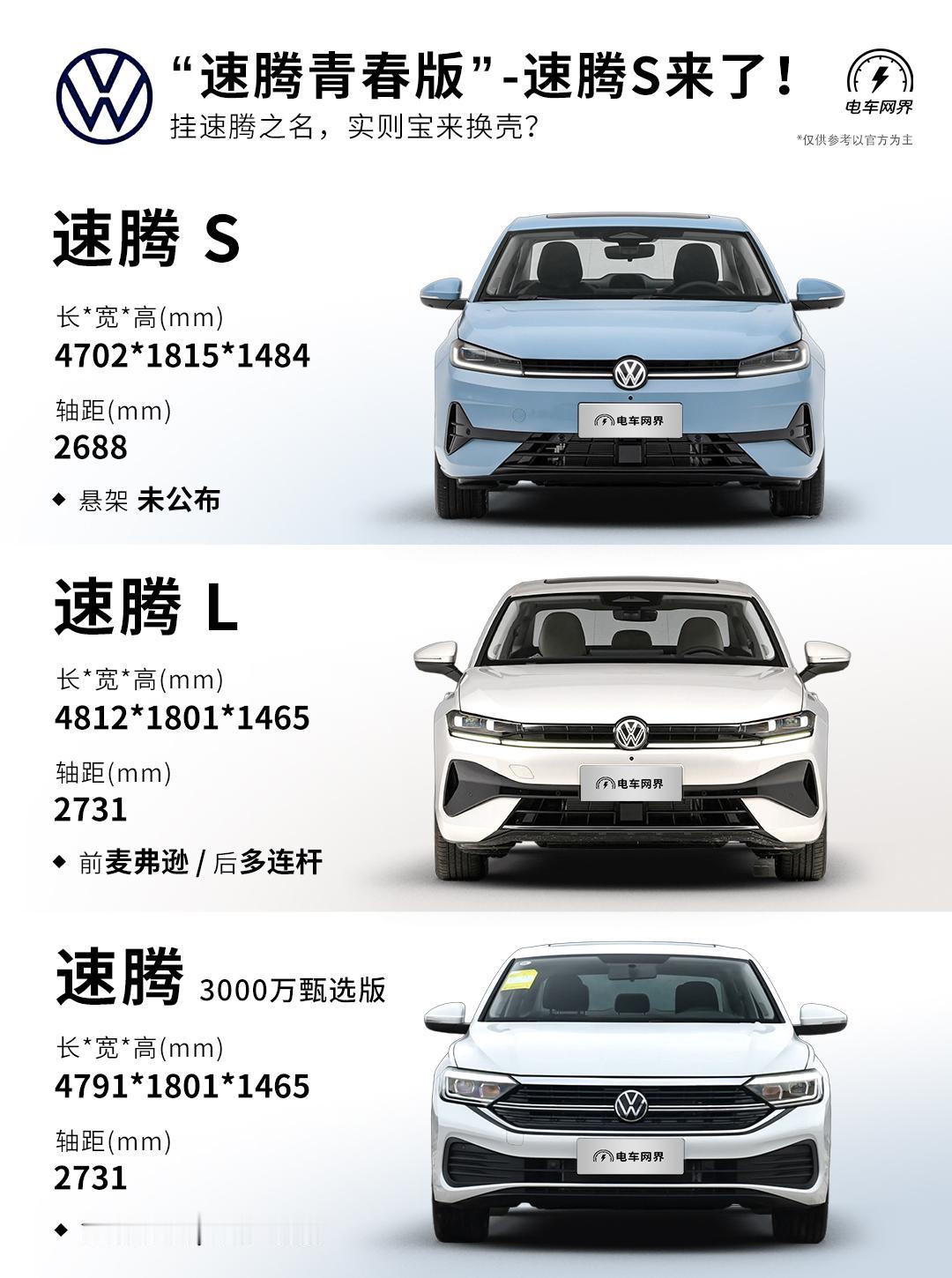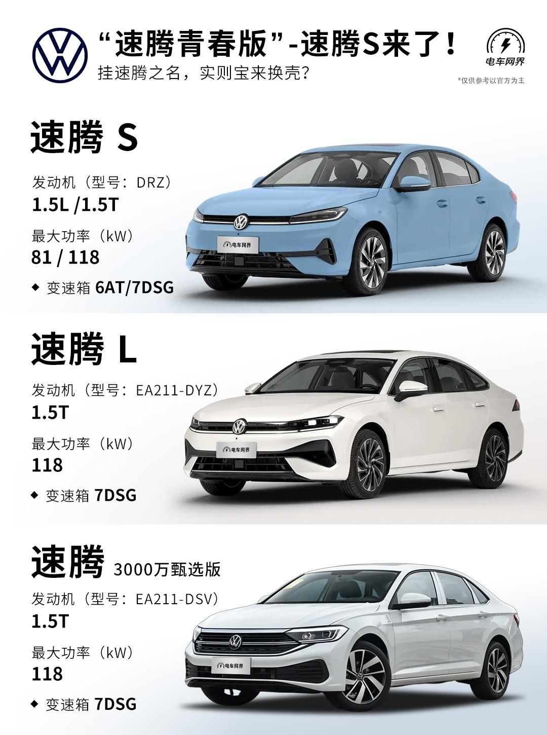 速腾家族的入门级新成员-速腾S正式亮相,主打年轻化设计,定位低于现款速腾L。 车身尺寸为4702/1815/1484mm,轴距2688mm,比速腾L短了43mm,在车宽和轴距上与宝来高度一致。 动力上。提供了更加入门的1.5L+6AT拉低门槛,1.5T EVO2+7DSG版:最大功率118kW,零百加速8秒级。 速腾S很可能是宝来换标升级的产品,主打入门级市场,预计将于3月份上市,价格有望低于10万起售,届时将会有速腾S(青春版)、速腾L(标准版)、速腾3000万甄选(经典版)共三个版本可选,你期待吗?【来自懂车帝车友圈】
