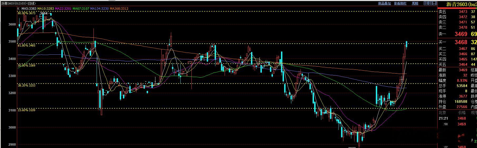 沥青最高触及3500 短线应该进入震荡期,也不排除继续有小新高 !但应该是震荡!