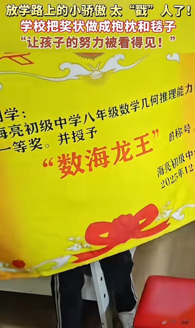 创意不错,应该推广啊! 近日,在浙江诸暨海亮初级中学的放学路上,一幕可爱又暖心的场景引发关注:有学生身披印着奖状的黄色“龙王毯”走在街头,还有学生抱着同款抱枕,瞬间成为整条街的焦点。 这是学校为表彰在八年级数学几何推理能力比赛中获奖的学生,特意设计的创意奖状。一等奖的奖品是印有“数海龙王”称号的毯子,二等奖则是同款抱枕。这种把奖状做成日常用品的形式,不仅让孩子的努力被看得见、带得走,更让这份荣誉能在生活中持续陪伴他们。 学生们披着毯子、抱着抱枕走在放学路上,既成了一道独特的风景线,也让“努力被看见”不再是一句口号。不少路人纷纷驻足拍照,点赞这种既有趣又有仪式感的奖励方式。