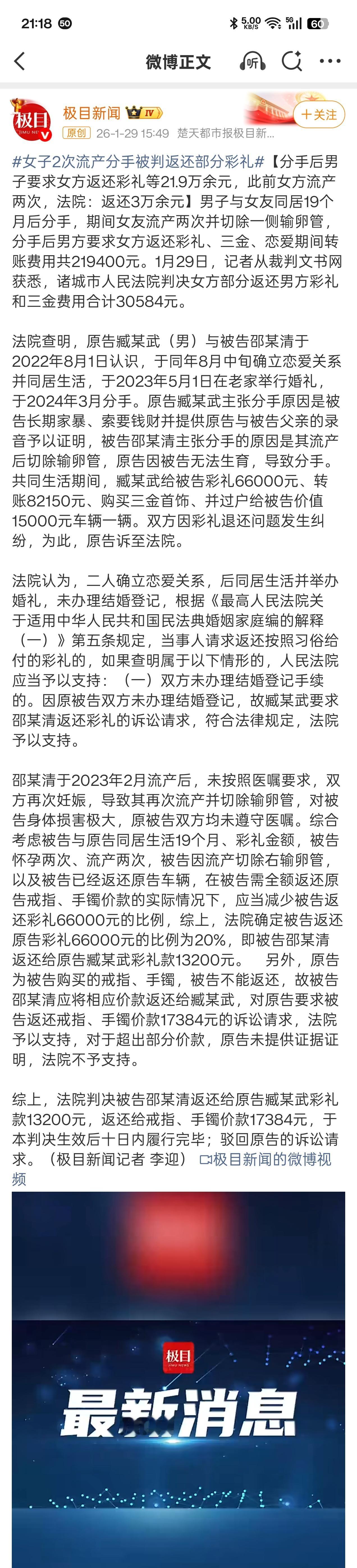 女子2次流产分手被判返还部分彩礼不知道怎么说,好阴间的社会新闻……