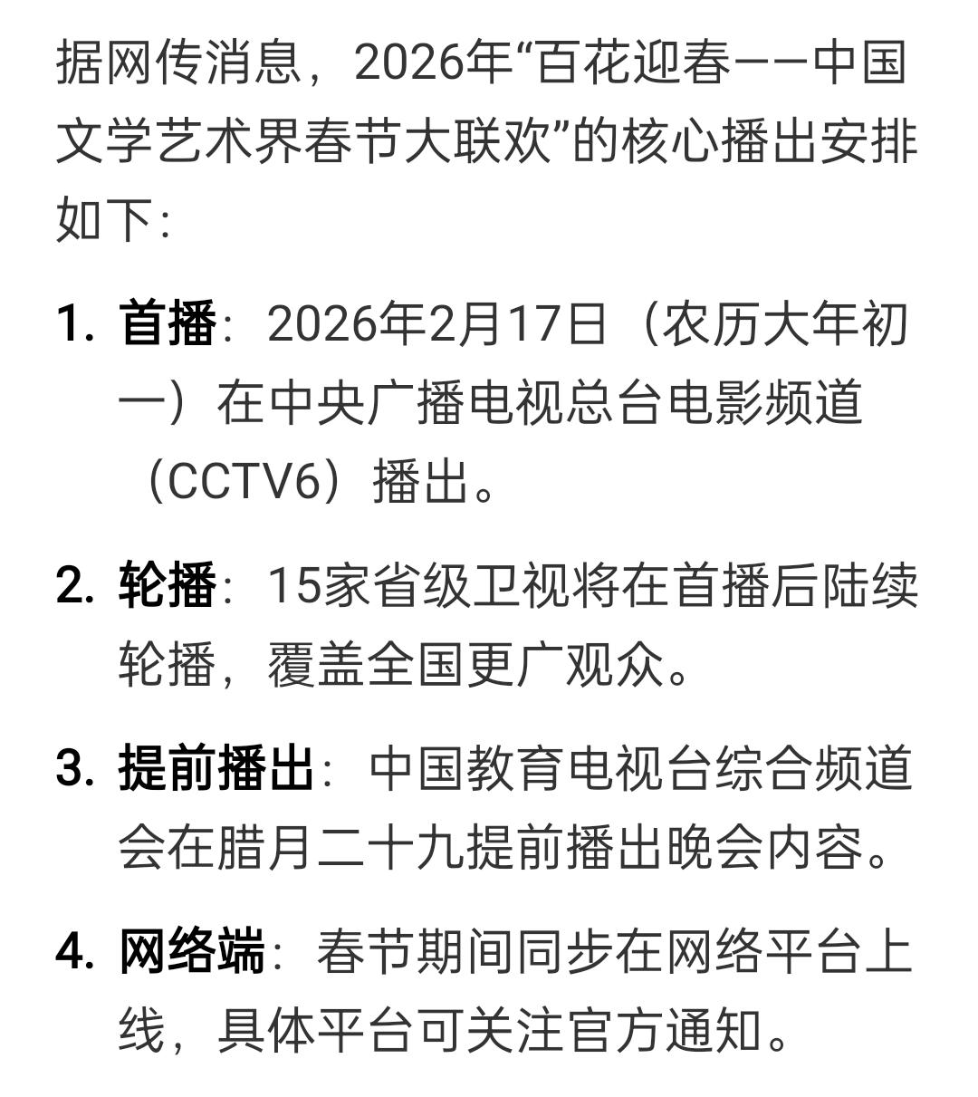 据网传消息,2026年“百花迎春——中国文学艺术界春节大联欢”的核心播出安排如下: