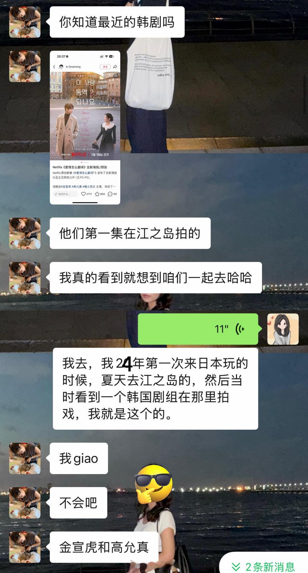 震撼首发,江之岛偶遇金宣虎和高允真去年在江之岛游玩突然看到一大群人、摄影机、工作人员来来回回,当时还有小韩工作人员用韩语在现场维持秩序跟来往行人致歉我还在想:这是什么综艺?直到最近我朋友说她看《爱情怎么翻译》,真的在江之岛取过景。我越看越不对劲,越想越熟悉。然后我们把时间、地点、主角妆造一对!……真的就是那一天!!!原来我曾站在一部韩剧的拍摄现场,却毫不知情。这大概就是旅行里最离谱、也最浪漫的意外吧。爱情怎么翻译‖