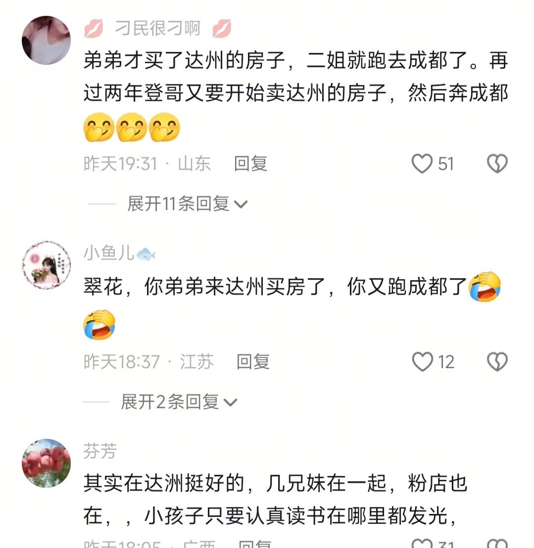 看到超小厨夫妇,突然官宣要搬去成都了,我忍了 看到他们还说在成都买了房子,我也忍了 可是看到明年不仅搬家,还要在成都开米线分店,我实在忍不住了 谁能想到,在达州刚安家没两年的超小厨夫妇,突然官宣要搬去成都了?刷到视频时我直接懵了,评论区也炸了锅,有人说瓜兮兮,有人夸巴适得板,这操作也太出乎意料了,咋突然就换城市了呢? 说实话,超小厨夫妇早年的日子,说起来都让人憋屈,俩人在外头务工,孩子留老家跟爷爷奶奶,超小厨一天打几份零工,稀了咣当忙到半夜,本来想就这么熬着,攒点钱就回老家安稳过日子,但后来发现短视频这风口,麻溜回了四川全职拍,当时我还跟朋友说,这俩人怕不是脑壳打铁了?自媒体哪有那么容易做。 嗯,他们还真就熬出来了,而且踩坑的经历也特真实,有次拍米线制作教程,镜头没架稳全拍砸了,食材也浪费了一大锅,俩人差点崩溃,连夜买食材重拍,没修图没剪辑,就那么真实拍出来,结果那条视频反而火了,评论区全说看着嘎嘎下饭,这波意外的收获,也让他们认准了真实就是最好的流量。然后就这么一步步,线上做起来了,线下米线店也开了三家,新房新车都置办了,还添了二胎,这日子过得,杠杠的,我和小伙伴都惊呆了,只能说努力的人运气真的不会差。身边还有人跟我说,这就是所谓的随缘,行至水穷处就坐看云起时,本来他们就只想陪孩子,结果反而把日子过成了花,你说怪不怪? 本来大家都以为,他们就扎根达州了,毕竟杨翠花的大姐在达州,弟弟前段时间也刚在达州买了房准备装修,姐弟仨凑一起,相互照应多好,结果他俩突然说要去成都,评论区瞬间就吵起来了,有人说“不是吧?刚安家又搬,咋整啊?”还有人膈应,觉得分开了姐弟间就生分了,甚至有人扯把子说他们是赚了钱就飘了,当时我也纳闷,好好的咋就突然换城市? 结果超小厨直接在视频里晒了成都的新房,还官宣今年是一家人在达州的最后一个年,明年不仅搬家,还要在成都开米线分店,这波操作直接让我绷不住了,也太惊喜了吧!后来才发现,他俩压根不是一时脑热,是等弟弟在达州安了家,能照应着大姐,才敢放心搬去成都,怕大姐一个人在达州没人管,没想到看着大大咧咧的夫妻俩,心思居然这么细。有人说这就是别人讲的那种善缘,心里装着身边的人,付出的心意总会有回响,现在想想,还真是这么个理儿。 总之,我想说的是,其实看超小厨夫妇这一路,我就觉得生活压根没有固定的标准答案,本来想按部就班过安稳日子,结果拐个弯可能更巴适。咱别被眼前的安稳绑住,想做的事就麻溜去做,别犹豫,但也别忘身边的人,毕竟日子是跟在乎的人一起过出来的,不是自己硬熬出来的。你说是吧!