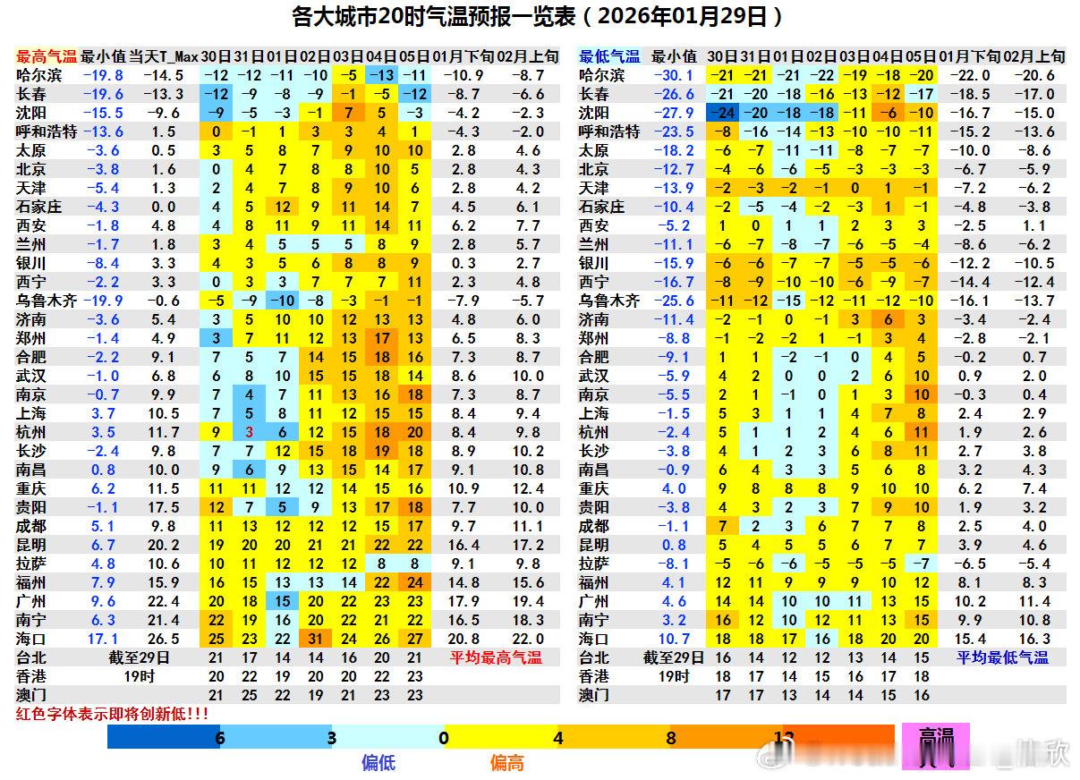 【气温探底回升】未来2天冷空气和降水,使得南方部分地区还有明显降温,甚至出现倒降走势,使得下午同比的24小时降幅,可能比最高气温的降幅还要更大一些。1月30日下午对比1月29日下午,在湖南南部、贵州西部、云南东北部、四川盆地西部向高原地区过渡带,降温可能超10℃。1月31日下午对比1月30日下午,浙江南部、福建西部、江西东部和南部、广东北部等地降温可能超10℃。从最高气温看,北方大多1月30日、南方大多1月31日,降至近期低点。随后,气温明显回升,包括之前气温偏低的东北,在2月3日都有望转为偏高。沈阳2月3日最高7℃,将结束1月13日以来连续低于0℃以下情况。而且2月4日立春,立春前后长江中下游多地气温可能超15℃。不过这样超前的温暖,并不会持久。目前预报看,2月5-6日又有明显冷空气南下,因此南方立春前后的温暖,又是一次春天体验卡,不是真入春。