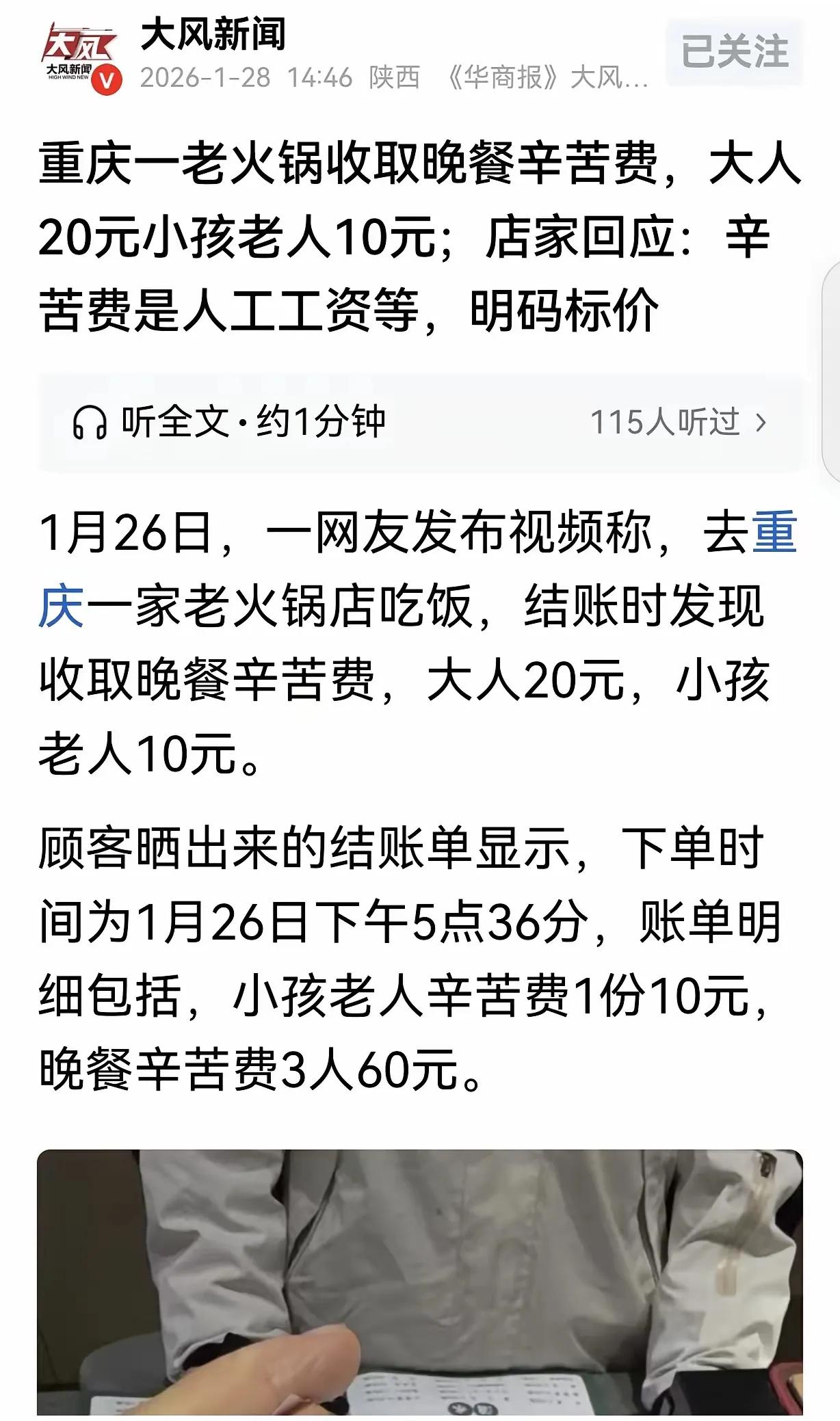“离大谱了!”重庆,一女子和家人去重庆老火锅吃饭,花了240.9元,结账时,女子惊讶的发现,火锅店收晚餐辛苦费,大人每人20元,小孩老人每人10元,一共收了她70元辛苦费,女子气的不轻,火锅店却回应:辛苦费明码标价,菜品和酒水都是按进价卖的,有异议的,就给免单。网友:老板还可以收场地费,因为要交房租啊! 涉事的火锅店就在重庆璧山区,是家开了8年的老火锅店,这次的辛苦费是店家最近才调整的收费方式。老板直言菜品和酒水全按进价销售,素菜最便宜的1块钱,贵点的也就4块,荤菜通通不超过19块,压根没从菜品上赚一分钱,收的辛苦费就是门店唯一的利润,全用来支付房租、水电和员工工资了。女子被收的70块,就是3个大人加1个小孩的晚餐辛苦费,店家还说午餐的费用更低,大人只要15块一位,可就算这样,女子还是气不过,换谁吃饭全程没人提这事,结账突然冒出来一笔额外收费,心里都得膈应。 店家一直强调辛苦费是明码标价的,说菜单上有标注,门店门口也贴了提示,还会在顾客点餐时口头告知,可实际情况根本不是这样。女子和家人从进店点餐到用餐结束,没有任何一位店员提过辛苦费,直到结账单打出来,才看到这个凭空出现的收费项,这根本不是明码标价的问题,而是店家彻底没履行告知义务。咱们普通人出去吃饭,关注的都是菜品价格,谁会特意去翻找菜单角落或者门店的每一个张贴处,就为了找一个从没听过的收费项目。 这事在网上发酵后,当地市场监管局的动作特别快,1月29日“璧山发布”微信公众号发布了官方通报,央广网、新华网也同步报道了核查结果,明确确认了这家火锅店的违规行为,当场责令店家立即停止收取辛苦费。监管部门的说法很明确,这种在餐费之外自行增设收费项目的行为不合规,还要求店家严格按照市场规律收取合理利润,让消费者能明明白白消费,不会再遇到这种结账才发现的隐形收费。 有专业律师也针对这事给出了明确观点,餐饮行业的餐费本身就包含了合理的服务成本和经营利润,火锅店额外收辛苦费,既不符合餐饮行业的一贯惯例,也和咱们的餐饮文化相悖。就算店家真的做到了菜品酒水按进价销售,也应该把经营成本直接融入菜品价格里,明明白白标售价,而不是搞一个“辛苦费”的新名目单独收费,用这种方式来赚取利润,本身就存在很大问题。 店家说有异议就给免单,这话听着挺大气,实则根本站不住脚。免单只是事后的补救措施,弥补不了消费者消费前知情权的缺失。消费者去吃饭,要的是消费前就清楚所有费用,自主选择要不要吃,而不是结账时被突然告知有额外收费,只能在付钱和提异议免单之间做被动选择,这本身就不是平等的市场交易关系,就算最后免单了,也已经影响了消费者的用餐体验。 网友的吐槽其实戳中了这件事的核心问题,除了调侃老板还能收场地费,还有人说照这个逻辑,是不是以后还能收洗碗费、燃气费、服务员端菜费。咱们国内的餐饮消费,一直都是菜价包含所有经营成本和服务成本的模式,大家早就形成了固定的消费预期,突然冒出来“辛苦费”这种奇葩收费名目,就算真的明码标价,也很难让人接受,更别说如果放任这种行为,后续可能会有更多商家效仿,搞出各种五花八门的收费,最后乱的还是整个餐饮市场。 这家开了8年的老火锅店,说到底也是想在餐饮内卷的环境里找条出路,想着用菜品进价销售的方式吸引顾客,这本无可厚非,但错就错在选了违规的方式赚取利润。餐饮行业的创新,从来都不是创各种收费名目,而是在菜品口味、服务质量上用心,就算真的要收取服务费,也该用行业通用的说法,在消费者点餐时主动、明确告知,让人家有充分的选择余地,而不是藏着掖着等结账才说。 这件事也给所有餐饮商家提了个醒,明码标价不是简单的贴张纸、标个价就完事,更重要的是履行充分的告知义务,把消费者的知情权和选择权放在第一位。同时也让咱们消费者清楚,遇到这种商家自行增设的莫名收费,不用忍气吞声,首先要保留好消费凭证、结账单等证据,既可以当场和商家提出异议,也能直接拨打12315热线或者通过全国12315平台在线提交投诉,向当地市场监管部门反映,合法维护自己的消费权益。 市场的良性发展,需要商家守规矩经营,踏踏实实做产品和服务,也需要监管部门的及时介入,严厉查处各类价格违法违规行为,更需要消费者主动维权,遇到不合理收费敢于说不。只有三方共同发力,才能让餐饮消费市场更规范,让咱们普通人吃饭吃得放心、吃得舒心。 各位读者你们怎么看?欢迎在评论区讨论