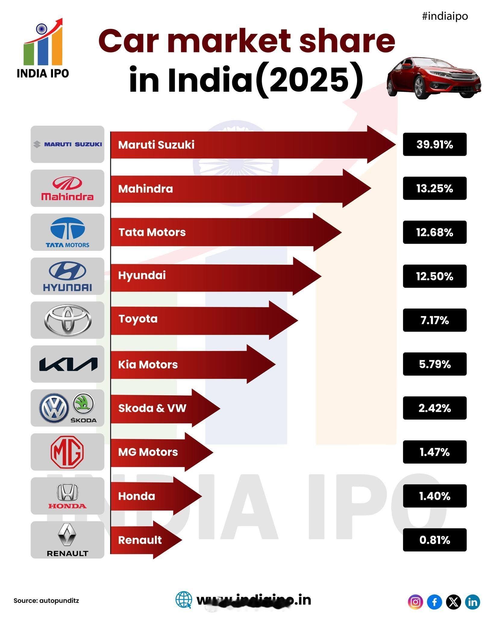 印度市场各家汽车品牌市占率Car market share in India (2025) 🇮🇳🚗1.🇯🇵 Maruti Suzuki – 39.91%2.🇮🇳 Mahindra – 13.25%3.🇮🇳 Tata Motors – 12.68%4.🇰🇷 Hyundai – 12.50%5.🇯🇵 Toyota – 7.17%6.🇰🇷 Kia Motors – 5.79%7.🇩🇪🇨🇿 Skoda & VW – 2.42%8.🇬🇧 MG Motors – 1.47%9.🇯🇵 Honda – 1.40%10.🇫🇷 Renault – 0.81%印度丰田大众