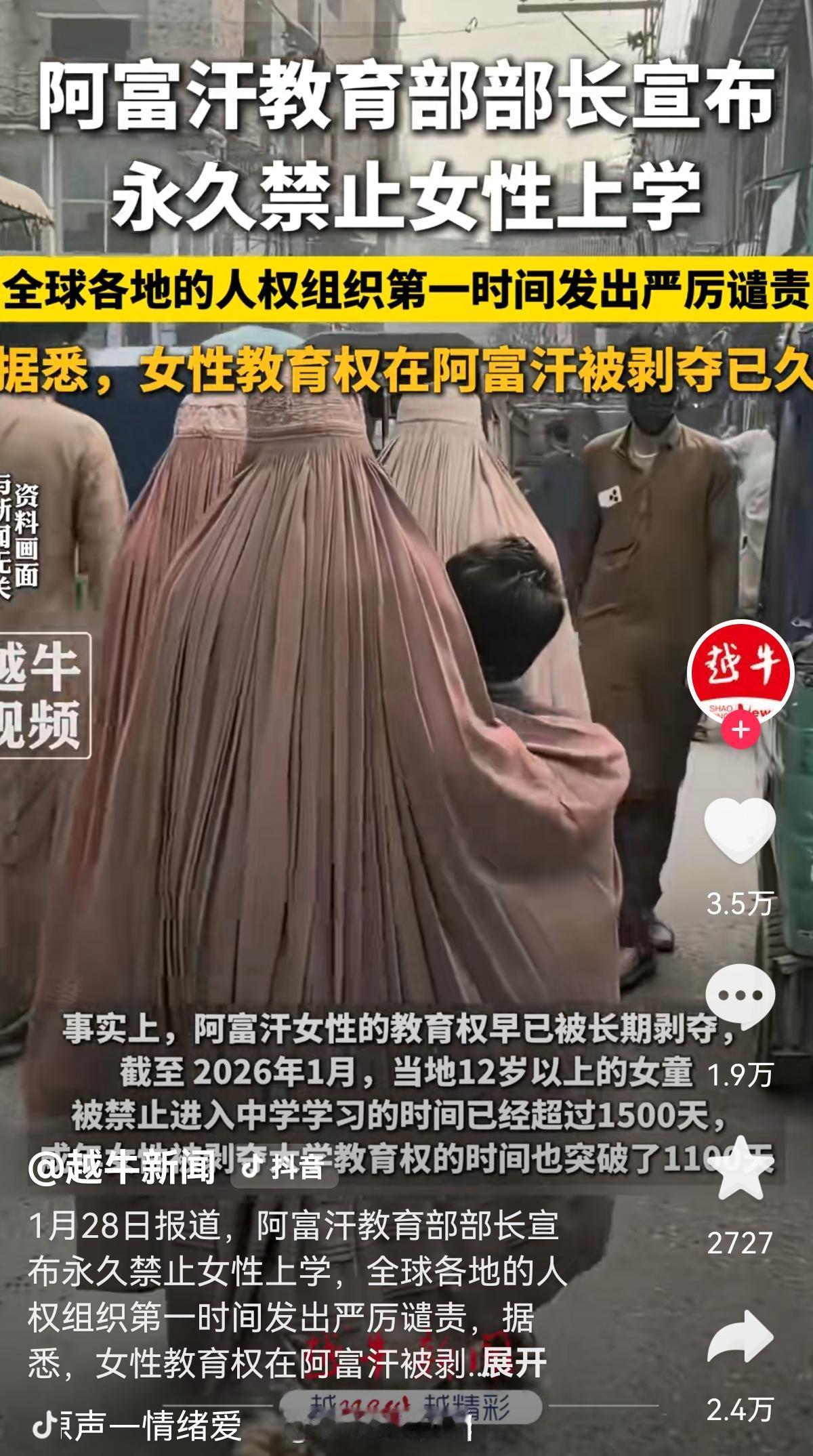 没想到在21世纪的今天, 还有国家禁止女性接受教育? 阿富汗对女性的教育限制持续收紧, 其实早在2021年, 阿富汗就已经禁止女性上中学了, 到2022年关闭了女子大学, 而最近更是直接宣布永久禁止女性接受中学及以上教育, 阿富汗也成为目前全球唯一系统性限制女性中高等教育的国家。 有人说这是为了恢复人口出生率而想出来的对策,你认为呢? 在我们身边, 男孩女孩享有平等的受教育机会, 这是再正常不过的。 可对那里的女孩来说, 出生与性别, 仿佛早早限定了她们的人生。 人人平等,是现代文明的基本共识, 受教育权是每个人的基本权利, 本不该因性别而被剥夺。 一个国家的进步, 离不开每一个人的成长, 更离不开女性的参与和力量。 所以我们庆幸生活在一个重视教育、守护平等的国度!