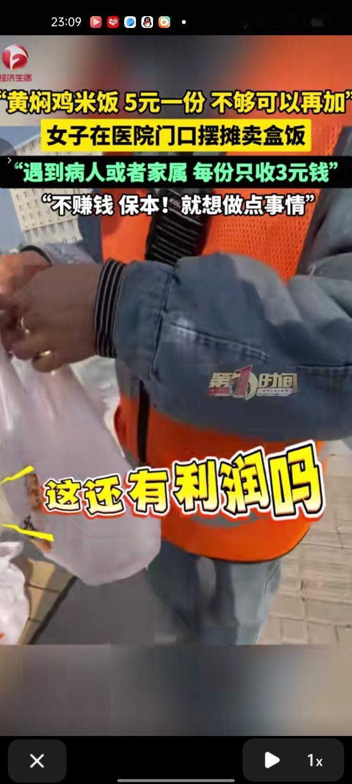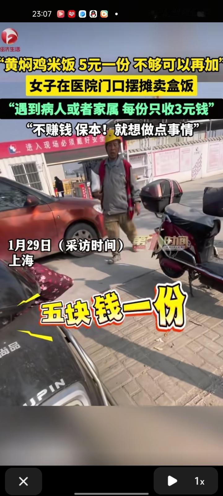 1月19日,上海。女子去医院门口摆摊卖盒饭,那里病人和工友比较多,每份只收五块钱,遇到病人或者家属,每份只收三块钱。面对利润问题,她说:“不赚钱,保本!就是做些事情”。