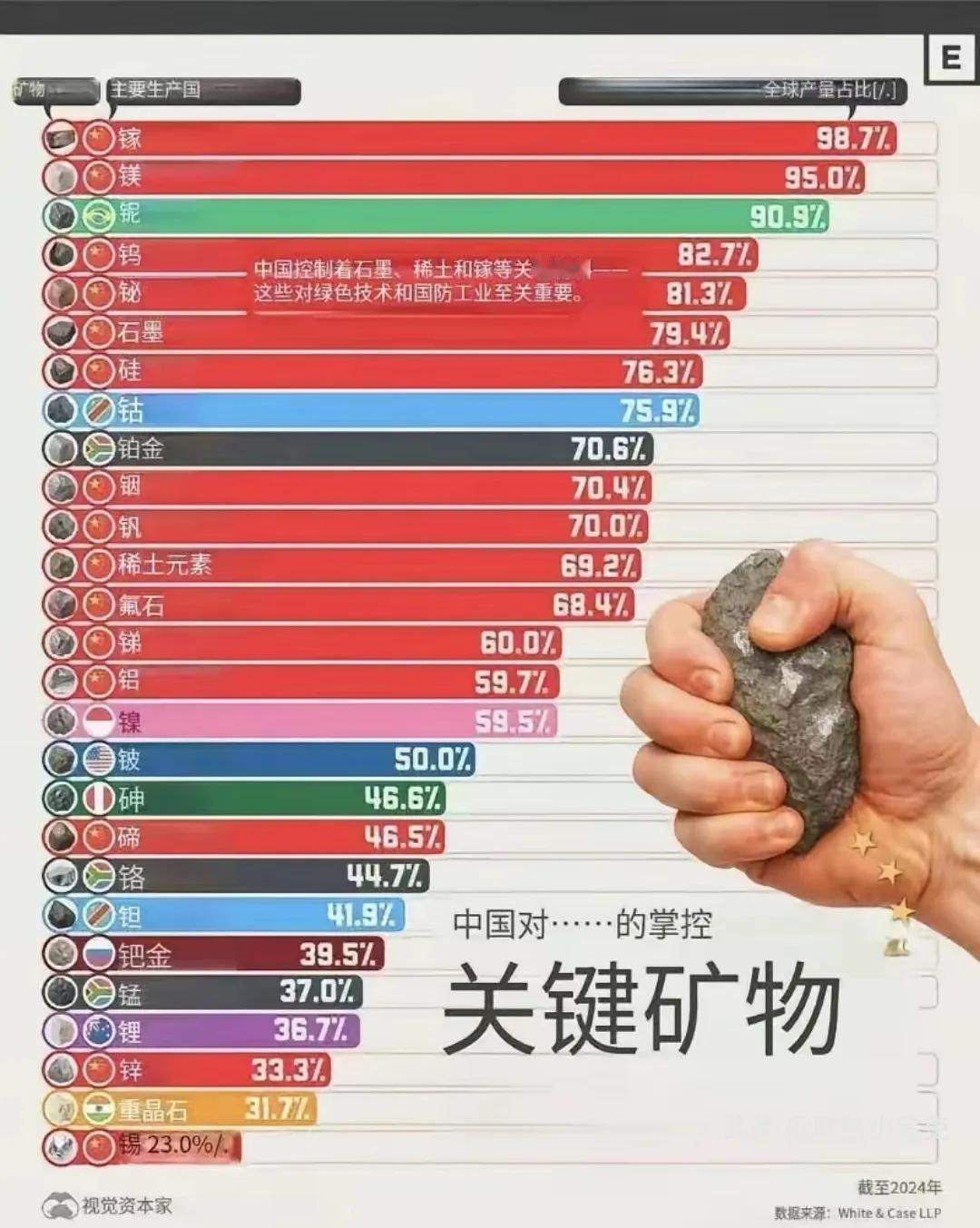 咱们掌控多少关键矿物质? 以2024年的数据统计为例,27种关键矿物质中,咱们占据世界第一的有15种,比例都超过一半了。 这些关键矿物质对绿色能源产业和国防工业,起着至关重要的作用。 它们的存在可以称得上是老天爷对咱们的“厚爱”,是老天爷“奖赏”给咱们,世界上多少国家日思夜想而不得。 正因为咱们手捧“金饭碗”,西方国家除了羡慕嫉妒恨的心理之外,终究是无可奈何。