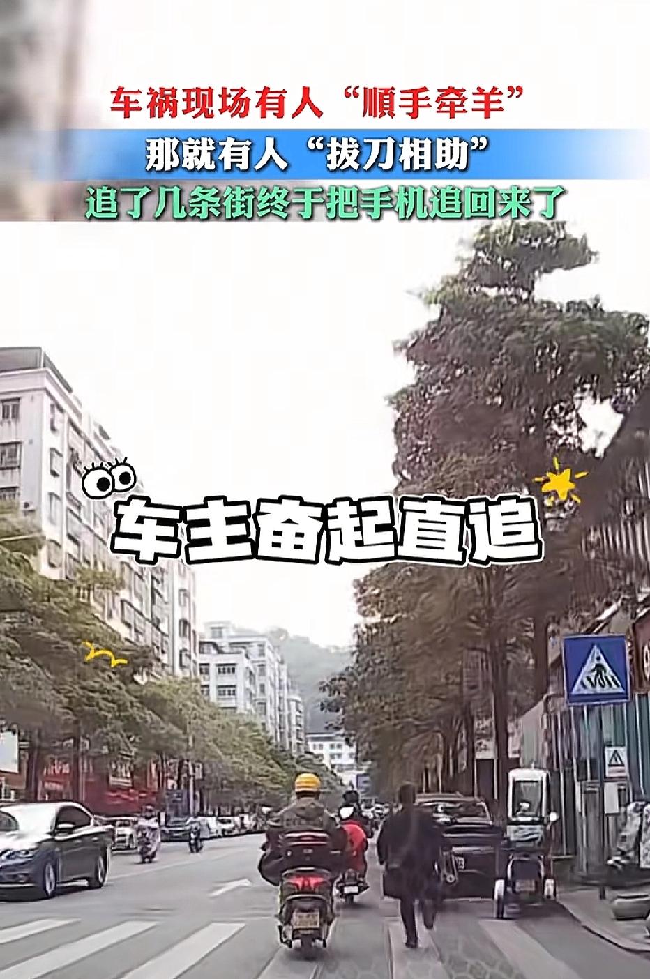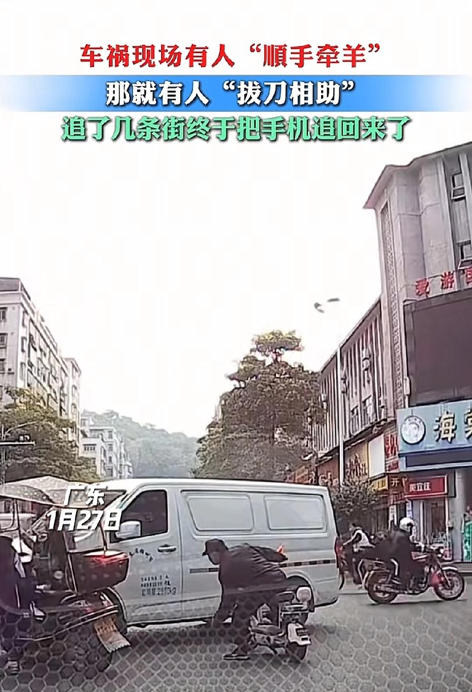 好个趁火打劫!广东,大爷看到前方路口出了车祸,凑过去发现地上有一部手机,便随手捡了起来。后车司机本以为大爷会帮忙还给机主,没想到大爷竟直接把手机揣进口袋,骑车就走。司机气得当即开车追了1公里,硬是将手机追回,还给了机主。 一辆私家车径直横在电动车前,硬生生将大爷逼停。 私家车主怒目圆睁,一把揪住大爷的电动车把手,语气里满是愤怒,说快把手机交出来! 而车上的大爷满脸慌乱,手死死捂着上衣口袋,眼神躲闪飘忽,根本不敢直视司机的眼睛,只想趁机拧动油门逃离现场。 周围的路人都满心疑惑,这位大爷究竟做了什么,竟让司机如此动怒,不惜一路鸣笛,接连追过三个路口,也要将他拦下? 这一切的起因,都要回到十分钟前,那个突如其来的车祸现场。 事发当时的十字路口,一辆面包车准备转弯时,与一辆直行的电动车发生了剧烈碰撞,“砰”的一声闷响,瞬间打破了街道的平静。 电动车车主连人带车重重摔在地上,疼得蜷缩着身体龇牙咧嘴。 面包车司机也吓得心头一紧,顾不上多想,立刻推开车门冲了过去,一边小心翼翼地查看伤者伤势,一边连声道歉,嘴里不停念叨着:没事吧。 好在电车主人无大碍,受了一些轻微伤,面包车司机心略略宽心,但车子却遭殃了。 司机弯腰查看车身情况,他的手机从口袋里滑落,“啪”地掉在冰冷的路面上。 而沉浸在事故处理中的面包车司机,满心都是伤者的情况,对掉落的手机浑然不觉。 周围的路人的注意力都集中在车祸本身,没人留意到那部静静躺在地面的手机。 就在这时,这位大爷骑着电动车慢悠悠驶来,看到路口有车祸,立刻来了兴致,随即看热闹。 他的目光在现场扫了一圈,先是漫不经心地看了看,然后他眼前一亮,发现了地上的手机。 大爷假装不经意地将电动车往手机方向挪了挪,弯腰假装整理车筐,手却飞快地伸过去,一把捡起手机。 这一切,都被停在后方不远处的私家车主看了个一清二楚。 他本来也准备下车帮忙,看到大爷捡起手机,心里还暗暗称赞:这位大爷挺热心,还知道帮忙收着手机。 他本以为大爷会站在一旁,等面包车司机忙完后归还手机,可接下来的一幕,却让他瞬间火冒三丈。 大爷揣好手机后,没有丝毫停留,也没有半点要归还的意思,立刻跨上电动车,拧动油门转身就走,那匆忙的样子,生怕晚一秒就被人发现。 “你站住!把手机拿出来!”私家车主再也忍不住,大声喊了出来。 可大爷像是没听见一样,不仅没停,反而蹬得更快了,电动车转眼就驶出了几米远。 “太过分了!别人出车祸已经够倒霉了,他还趁火打劫!”车主又气又急,顾不上下车理论,立刻发动车子,一脚油门追了上去。 为了提醒大爷停下,也为了让周围人注意到情况,他一路按着喇叭,“嘀嘀”的鸣笛声急促又刺耳,在街道上久久回荡。 大爷见有人追来还一路鸣笛,心里更慌了,拼尽全力蹬着电动车,在马路上左躲右闪,试图甩开身后的私家车。 而车主则紧追不舍,始终咬着电动车不放,喇叭声从未间断,就这样接连追过了三个路口,终于在这个红绿灯路口,抓住机会将大爷成功逼停。 这才有了开头的一幕。 面对车主的厉声质问和路人的纷纷指责,大爷起初还想狡辩,支支吾吾地说:“什么手机?我没拿,你看错了。” 可他紧紧捂着装手机的口袋,以及躲闪的眼神,早已暴露了一切。 “我看得清清楚楚,你在车祸现场捡的手机,赶紧拿出来!不然现在就报警,让交警来评理!”车主的态度十分坚决,丝毫没有退让的意思。 在车主的坚持和路人的集体指责下,大爷的脸一阵红一阵白,再也撑不下去了,头埋得低低的,只能不情不愿地从口袋里掏出那部手机,慢吞吞地递给了车主。 接过手机后,车主没有再多说一句,立刻转身开车返回了车祸现场。将手机归还给司机。 司机激动得连连感谢。 此事被曝光后,有网友为热心司机点赞,直呼大快人心:这司机也太帅了!路见不平拔刀相助,就该这样硬气,不能让这种缺德的人得逞! 干得漂亮!追了三个路口太不容易了,这才是普通人的正义,必须给这位司机点个大大的赞! 还有网友表示,司机的行为不仅帮失主找回了手机,更守住了社会的道德底线,这种正能量就该被大力传播,让更多人知道,正义永远不会缺席。 也有网友对大爷的行为表示气愤和鄙夷,纷纷谴责其趁火打劫的做法:一把年纪了,脸都丢尽了!别人出车祸已经够糟心了,他还想着占小便宜,良心不会痛吗? 真的是为老不尊,年纪大不是借口,做人的底线还是要有的,这种行为太让人不齿了! 对此你怎么看?