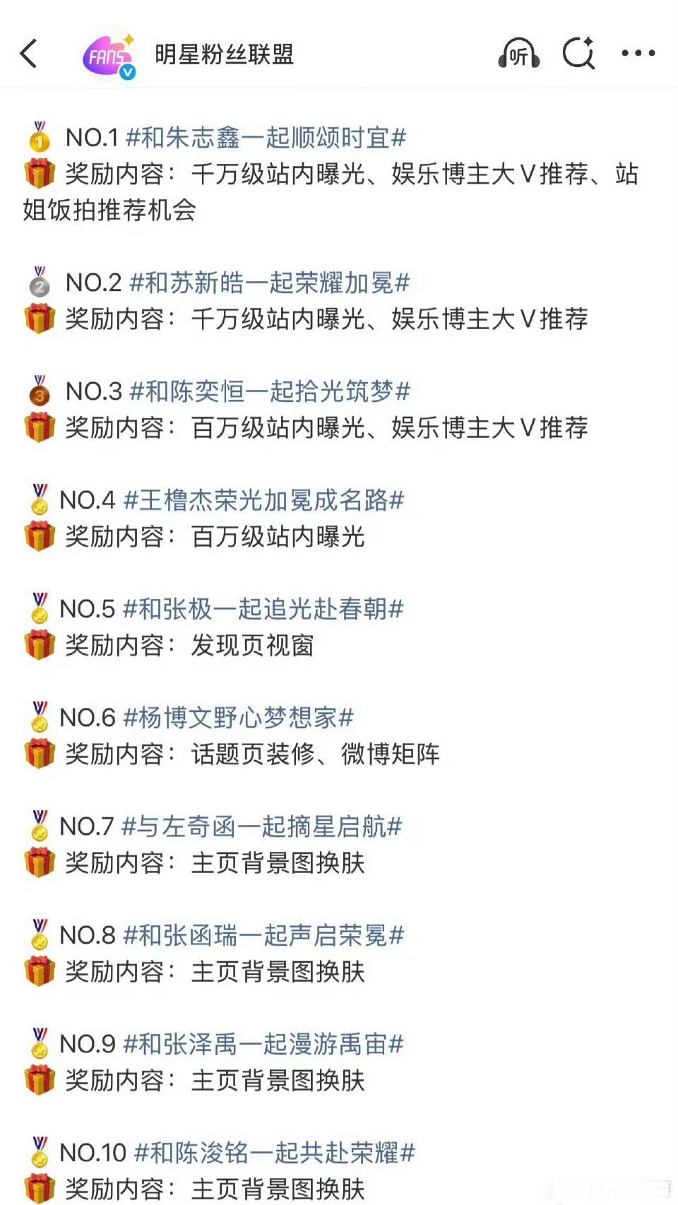荣耀之战活动TOP10:朱志鑫 苏新皓 陈奕恒 王橹杰 张极 杨博文 左奇函 张函瑞 张泽禹 陈浚铭