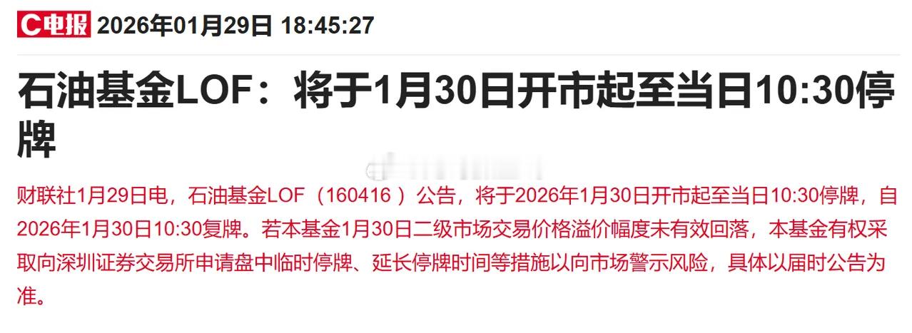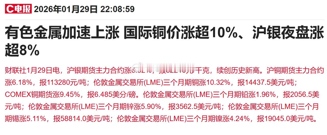 太疯狂了,上涨的情绪根本挡不住!今晚国际金属价格继续狂飙,难道周五周期有色还要继续大涨?罕见一幕再次上演,多只产品公告明天起停牌——难道又开始出手管控了?周五盘前,谈谈我的几点看法:一、盘后重要消息面梳理1. 有色金属继续大涨 国际铜价涨超10%,沪银夜盘延续升势,伦铜价格同样暴涨。尽管黄金涨幅有所放缓,但白银、铜等品种依然疯狂。当前大宗商品及有色金属的牛市仍在持续,价格上行趋势未见减弱。2. 中国银行调整白银合约参数 中国银行宣布上调白银延期合约的保证金比例,提示投资者注意风险。白银价格持续飙升,保证金上调可视为一种风险调控手段,但效果如何,还要看国际市场价格走势。3. 四川黄金股东减持 公司第三大股东过去两个交易日合计减持超百万股。黄金股近期大涨,股东逢高减持也算是“天时地利”。这种高位减持的现象,会不会在其他热门题材中蔓延?商业航天此前已有先例,值得关注。4. 石油基金LOF停牌公告 石油基金LOF(160416)公告将于2026年1月30日开市起至10:30停牌。今晚多只石油基金宣布停牌,主要出于对美伊局势升温、国际原油价格大涨的担忧。二、市场情绪:疯狂仍在继续从今晚消息来看,有色金属相关讯息多空交织,但最突出的仍是价格本身的疯狂上涨。这一轮涨价,长期有美元走弱支撑,短期受地缘局势催化,价格越涨越吸引资金涌入,行情已超出多数人预期。此时讨论风险或机会,意义已经不大。价格不由我们掌控,所有的预判在失控的涨势面前都显得苍白。我们唯一能做的,是应对而非猜测。我唯一能确定的是:越是疯狂,波动就越大。如果周期有色继续狂飙,对大盘指数也会形成支撑,4190点或许指日可待。三、多只产品停牌:是管控信号吗?多家基金公司旗下资源类LOF明日停牌,其中国投白银LOF更是全天停牌。这确实可视为针对溢价风险的管控信号,但更多是短期行为。价格源头仍在国际金属与原油市场,停牌或许能暂缓情绪,但很难扭转趋势。四、当前A股方向总结市场目前可分为三大主线:1. 涨价主线:贵金属、工业金属、原油化工等;2. 科技主线:AI应用、商业航天、AI硬件等;3. 权重蓝筹:金融、地产、白酒等超跌“老牌”板块。这三类分别代表市场中的“小登”“中登”和“老登”,近期轮动上涨特征明显。很多人感觉每天热点不断、涨停频出,但自己手中的票却不涨,甚至市场仍有超3000只个股下跌——这就是轮动行情的特点:踩对节奏就是大肉,踩错就与你无关。我们无法预判每天哪个板块最强,但市场目前离不开这三条线。对大多数人来说,关键是保持节奏、守住自己熟悉的领域,不要因错过而盲目追击——往往一追就套。五、最后一点感想今天盘后争议很大:有人看好涨价,有人押注科技,有人回归“老登”,当然也有人看空。但现实是,市场始终在轮动——连跌了三四年白酒,今天也能拉出放量大阳线。在这样一个日成交超过3万亿的市场里,我不会轻视任何一个板块。没有绝对的“该涨”或“不该涨”,只有是否跌出了足够的性价比。