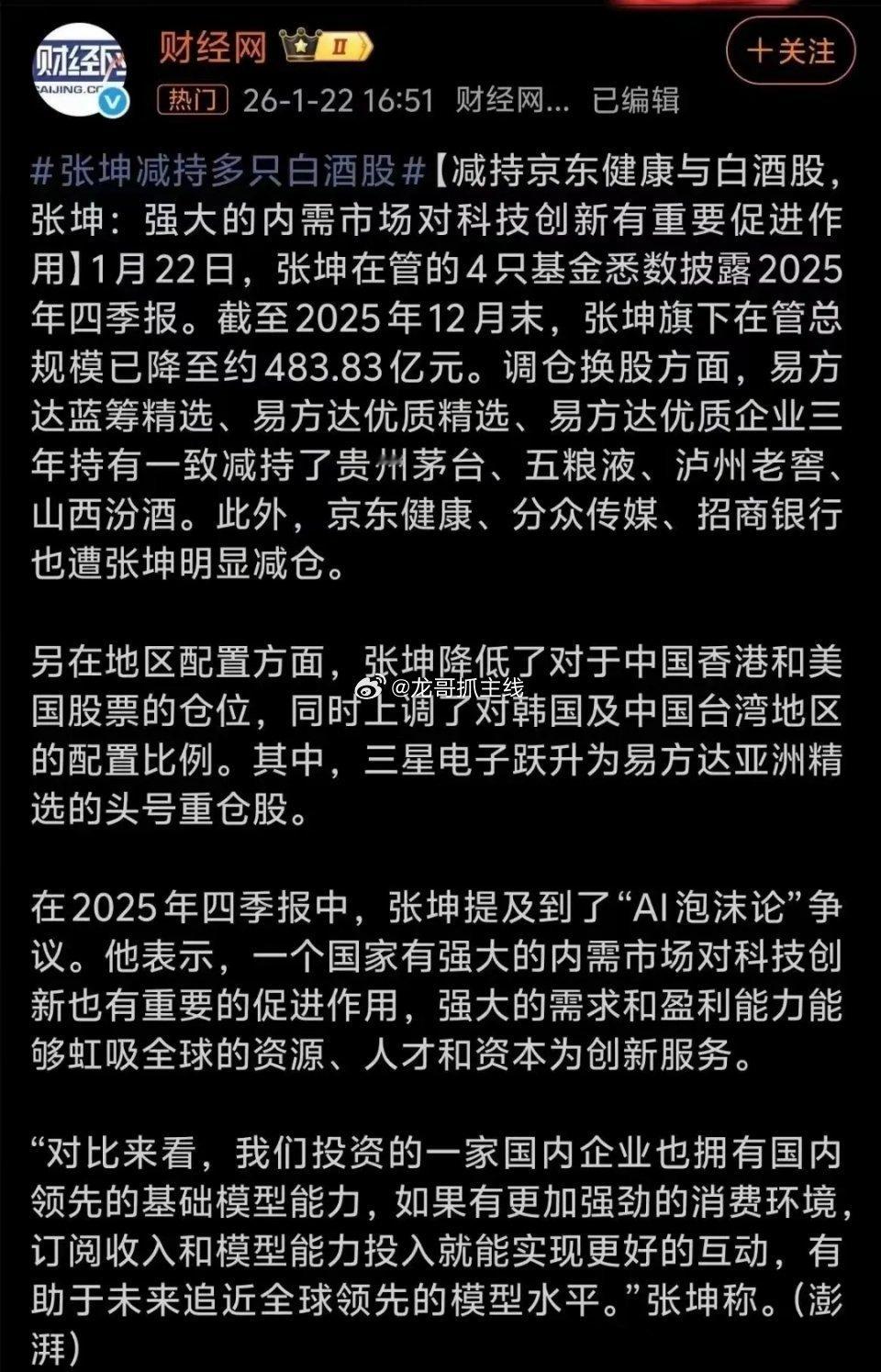 张坤刚减持白酒股,今天白酒就集体涨停,这是要拍短腿了,减持白酒拥抱科技,三星电子成为易方达亚洲精选的头号重仓股,三星电子,半导体、存储芯片,还是可以看一阶段的。