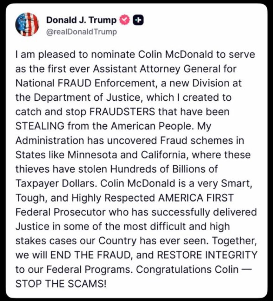 唐纳德.J.特朗普我很高兴提名科林.麦克唐纳担任首个国家欺诈执法助理总检察长一职,这是司法部新设的一个部门,旨在抓捕并阻止那些一直在从美国人身上窃取财富的欺诈者。我的政府已在明尼苏达州和加利福尼亚州等州发现了欺诈行为,这些窃贼已窃取了数千亿纳税人的资金。科林.麦克唐纳是一位非常聪明、坚韧且备受尊敬的美国优先联邦检察官,他成功处理过一些我国前所未见的最棘手、风险最高的案件,并在此过程中伸张了正义。让我们一起终结这场骗局,并恢复我们联邦计划的诚信。祝贺科林﹣﹣制止这些诈骗行为!【成立一个专门负责调查欺诈的部门】