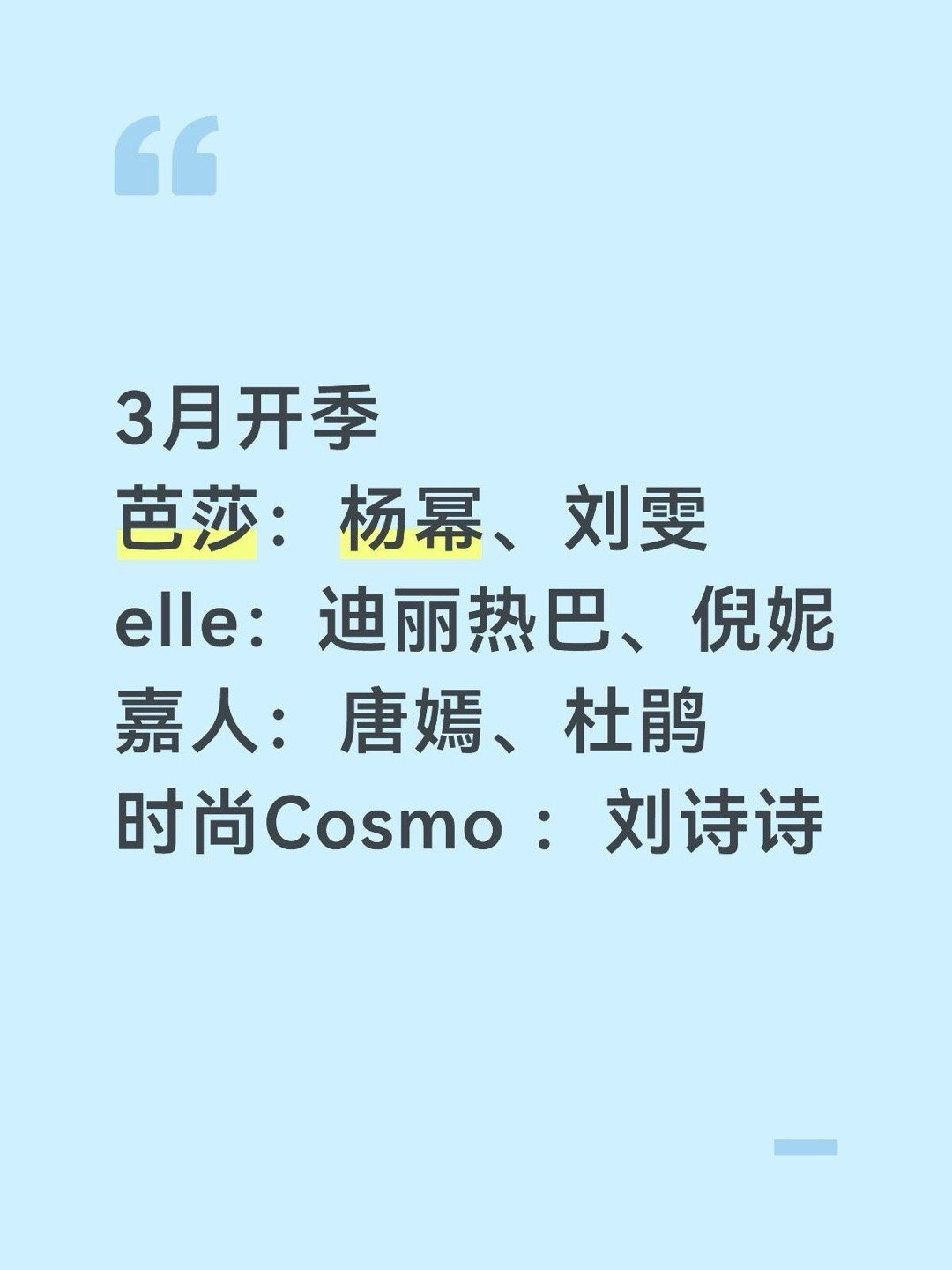 杂志🍉3月开季芭莎:杨幂、刘雯elle:迪丽热巴、倪妮嘉人:唐嫣、杜鹃时尚Cosmo :刘诗诗