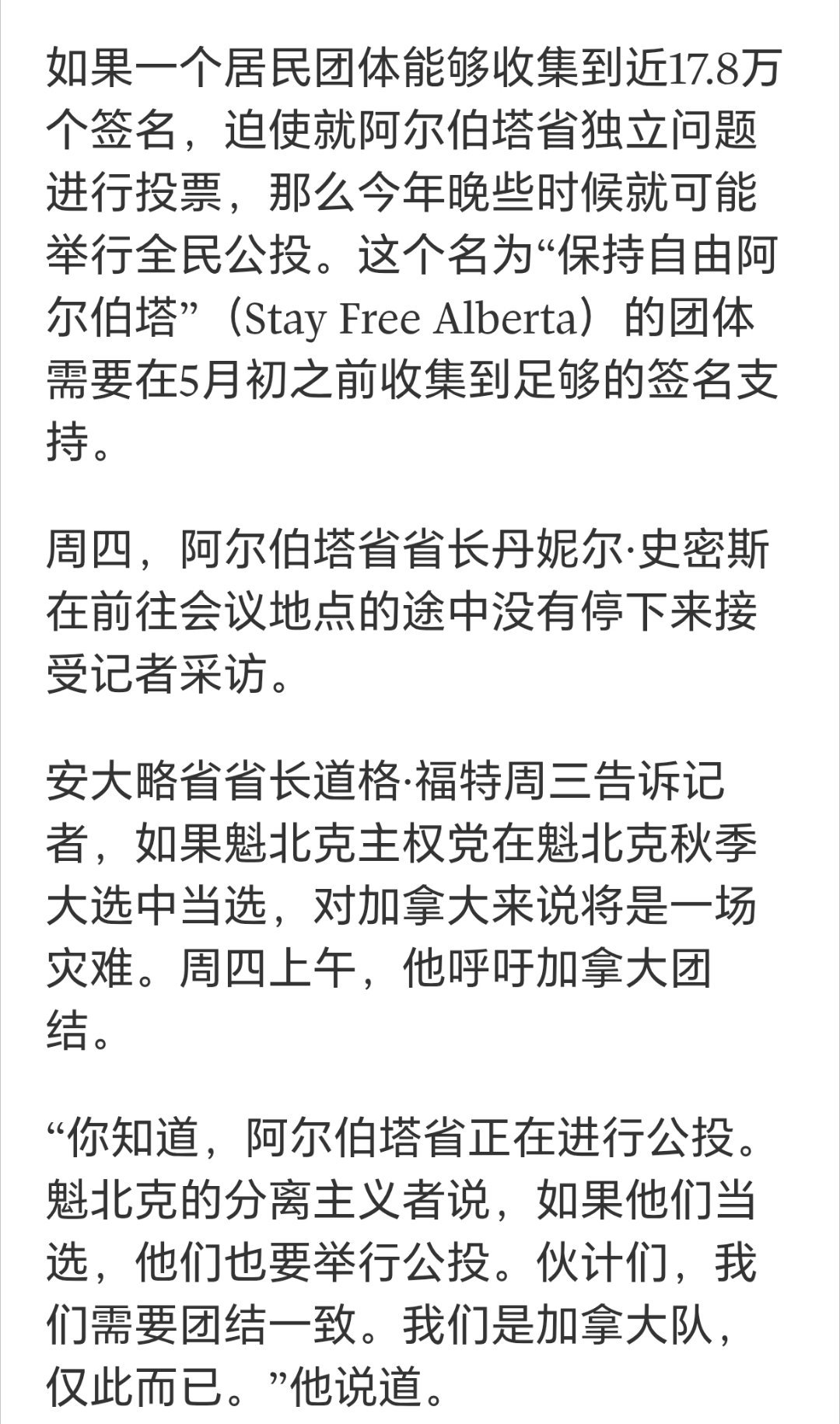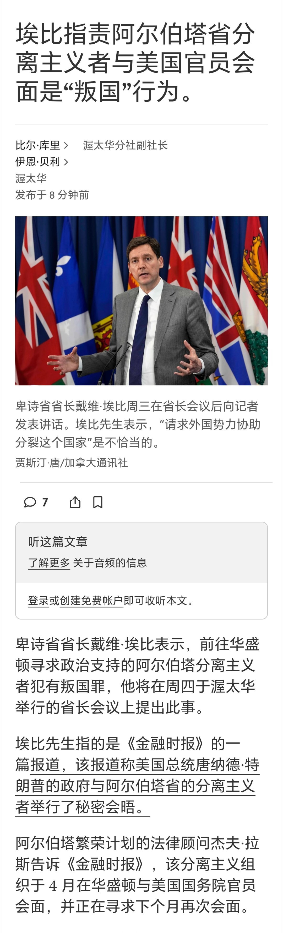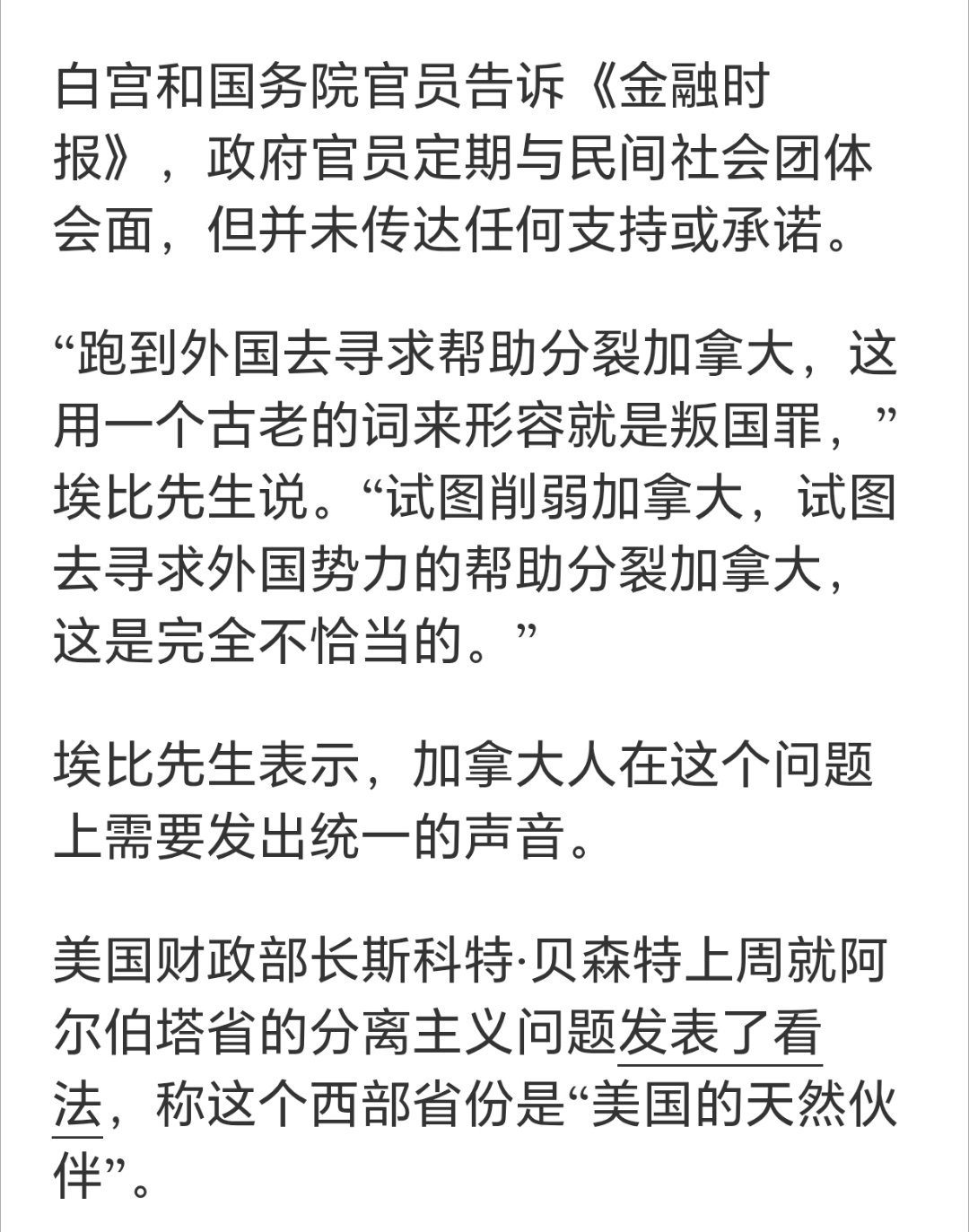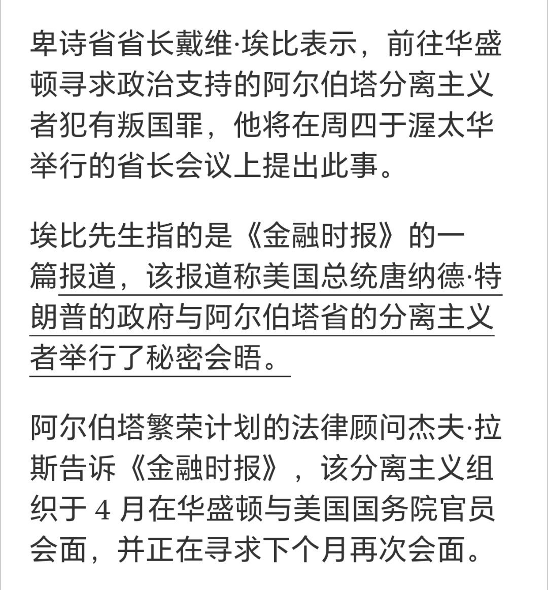 加拿大省长批阿省分离主义者叛国加拿大卑诗省省长戴维·伊比表示,阿尔伯塔省分离主义分子与特朗普政府的会面等同于“叛国行为”。