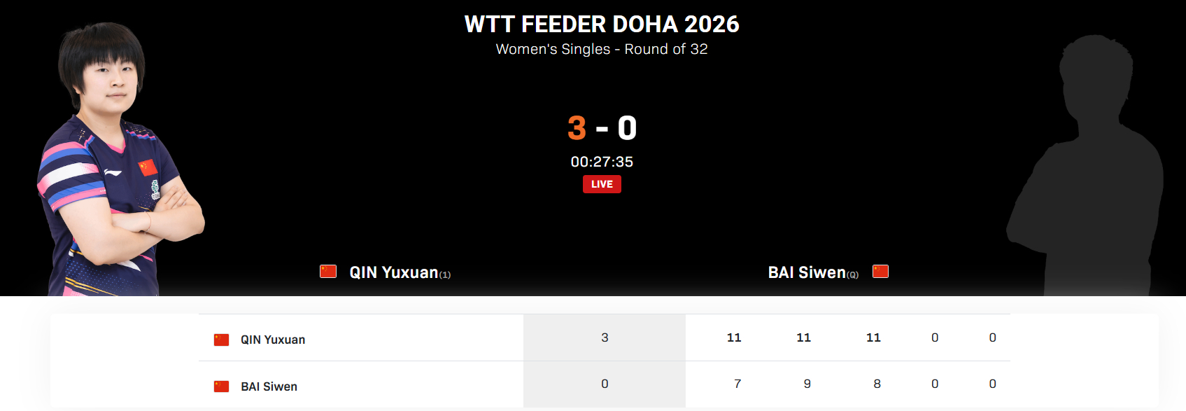 #覃予萱3比0白思文#2026WTT支线赛多哈站女单,覃予萱3-0战胜白思文,晋级16强。比分:11-7、11-9、11-8。#覃予萱vs白思文##看WTT上咪咕#
