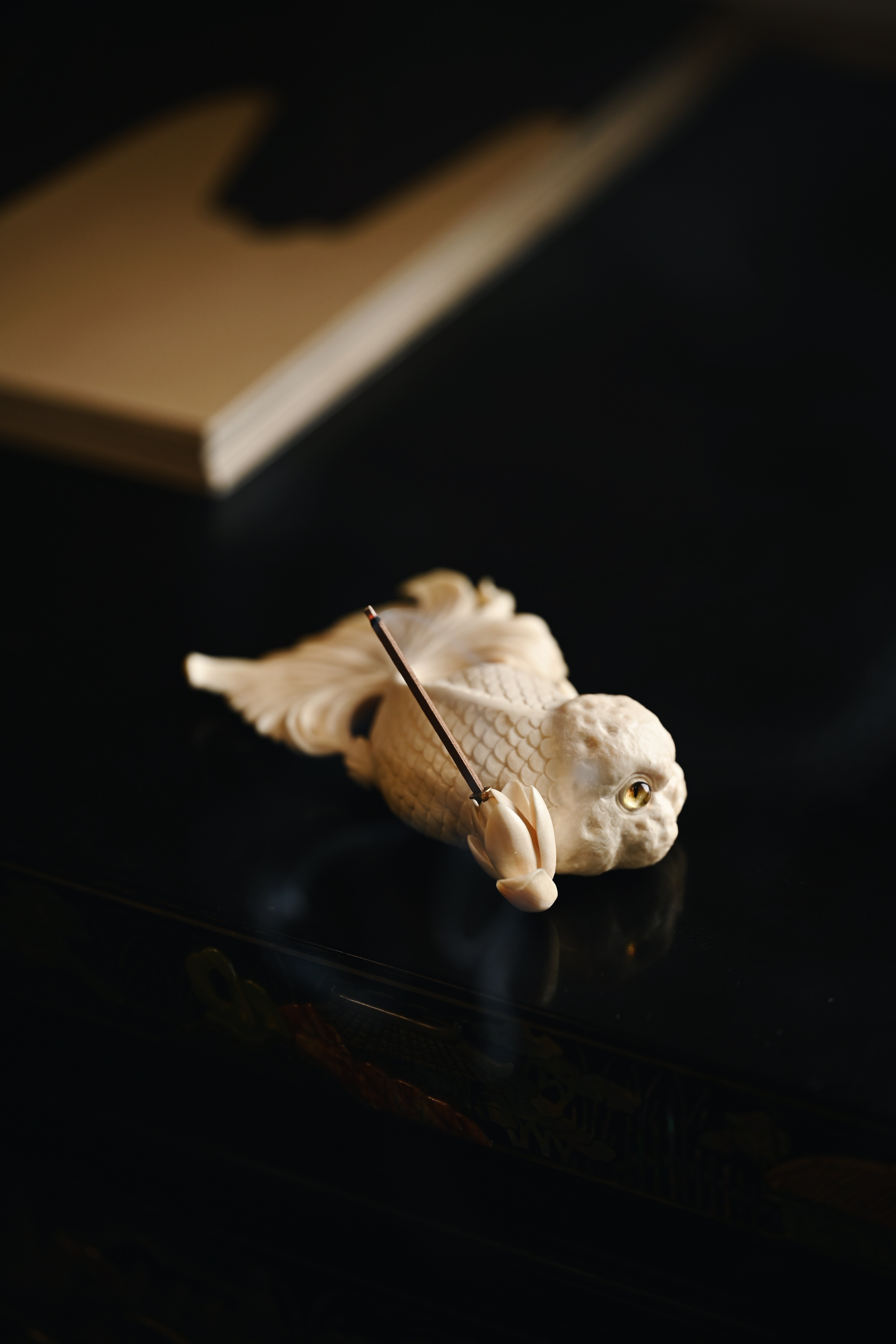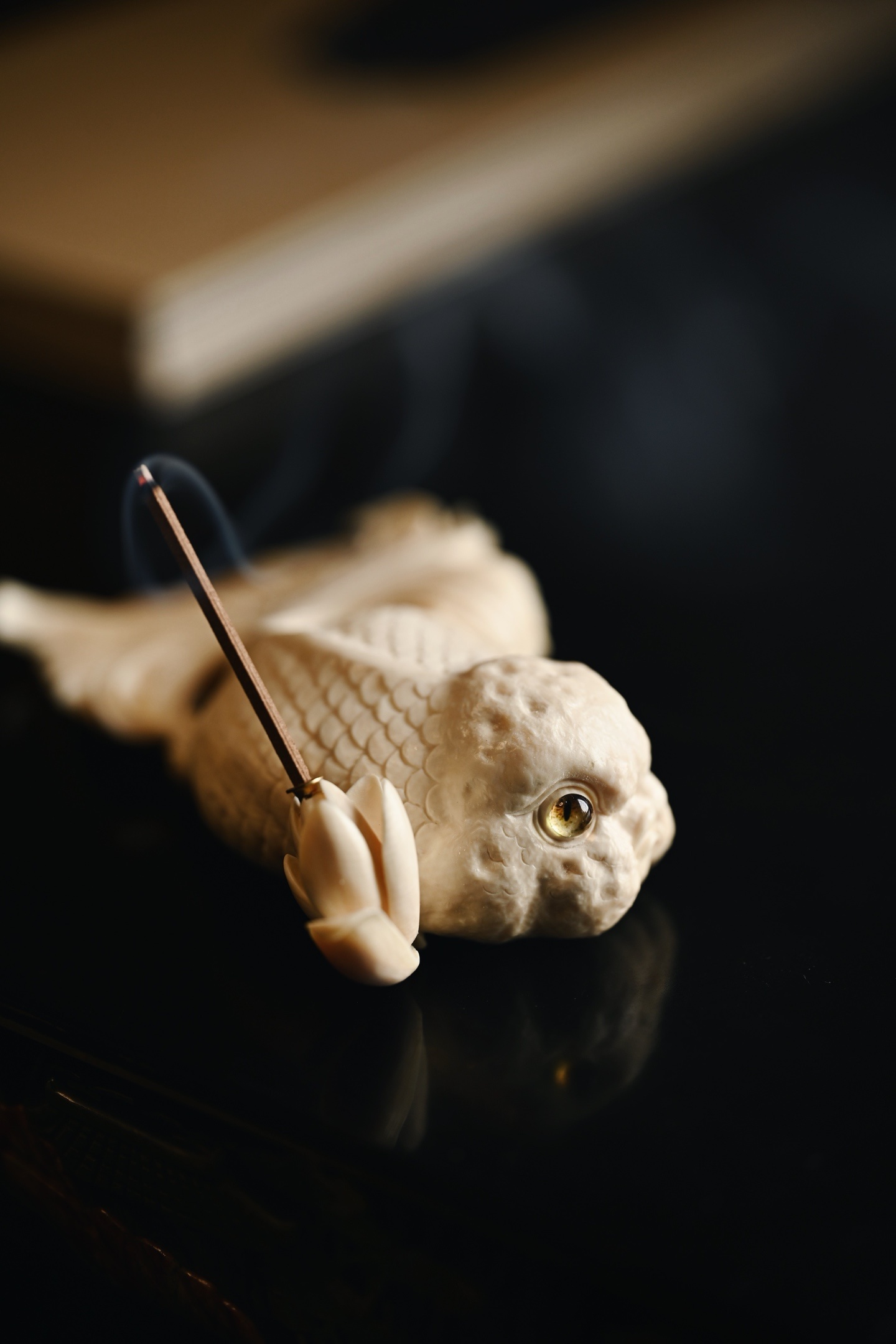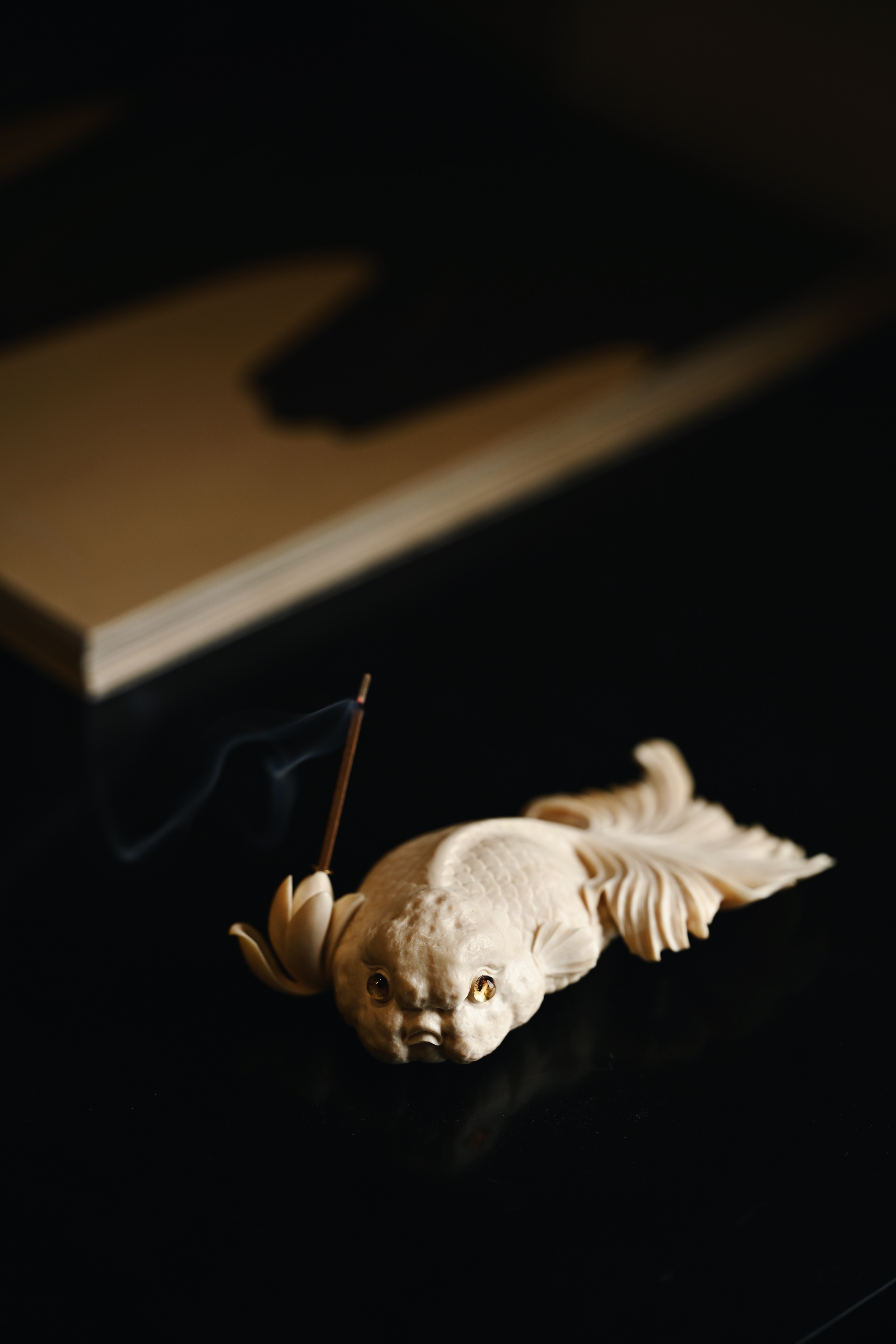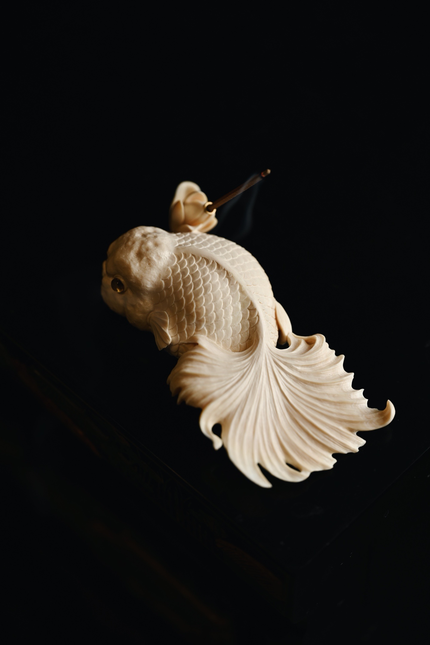 猛犸 | 金玉满堂 香插 摆件温润如脂的猛犸象牙,承载着远古的宁静与时光的馈赠。这件“金玉满堂”香插摆件,选料考究,雕工细腻,金鱼悠游的姿态栩栩如生,鳞片层叠如缕,尾鳍轻盈舒展,仿佛在水中漾开一缕生机。身畔一朵莲花静静盛放,花瓣柔美舒展,中间巧设香插,可立一线清香。青烟袅袅升起时,仿佛莲动鱼游,满室清雅。作品取意“金玉满堂,连年有余”,不仅是一件雅器,更是一份寄托吉祥、静心颐情的案头清赏。
